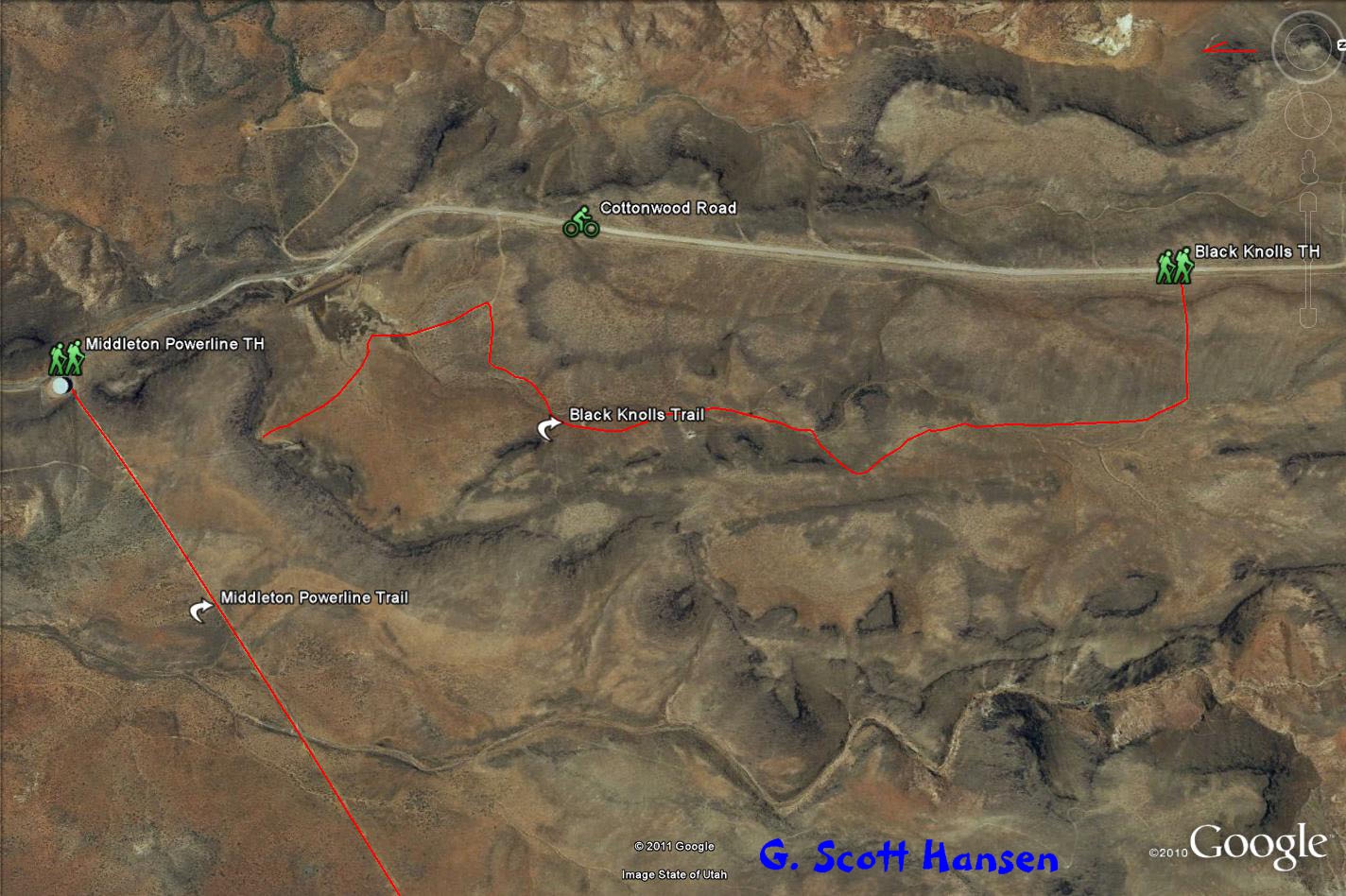 The Black Knolls trail is a lightly used equestrian trail that starts at a stepover on the Cottonwood Road about a mile and a half north of the large City of St. George water tank. There is no parking provided at the stepover. The trail follows a powerline maintenance road and ends abruptly at the top of the bluff above the Middleton Powerline trail. No link has been constructed to connect to the trail below as is shown on the original Reserve map. It is unknown whether the connection will ever be made. The southern half of the trail is frequently overgrown to the extent it is not always distinguishable to the naked eye. Approximately 2 miles long, the trail has a net elevation change of 200 feet with a total up and down change of 320 feet. The trail runs mostly across public lands managed by BLM within the Red Cliffs NCA. A modest tract of land near the trail’s center is managed by the Utah Division of Wildlife Resources and has been used as a vegetation rehabilitation site.