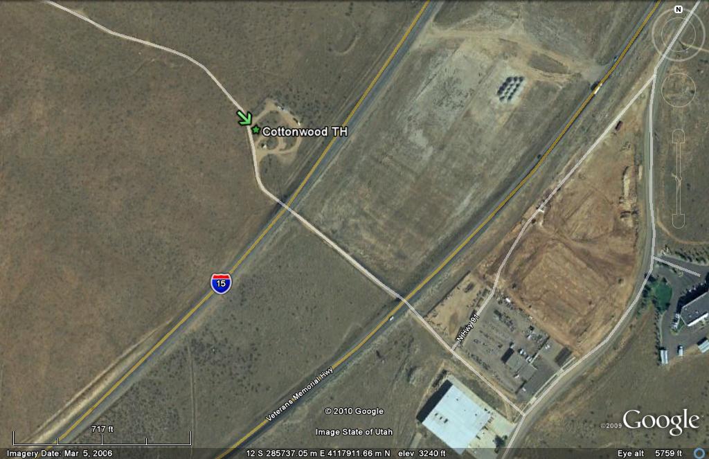 - Cottonwood trailhead aerial photo showing its location behind industrial park and Interstate 15 underpass.