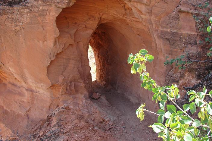 The trail may be readily accessed from the Danish Ranch Road on the Dixie National Forest from Leeds on the east or the Cottonwood Road on the west about 200 yards east of where the road crosses Cottonwood Creek. High clearance vehicles are a must. There is no parking area or trail sign, only one small pullover. The creek will be found adjacent to the road and should be followed into the canyon heading south (sometimes wet but more often dry). Even when water is running from the headwaters, it usually disappears at some point down the wash well before it reaches the lower sections of the canyon. The canyon should not be traversed during or shortly after precipitation events since high water floods carry large rocks and debris and can be fatal.