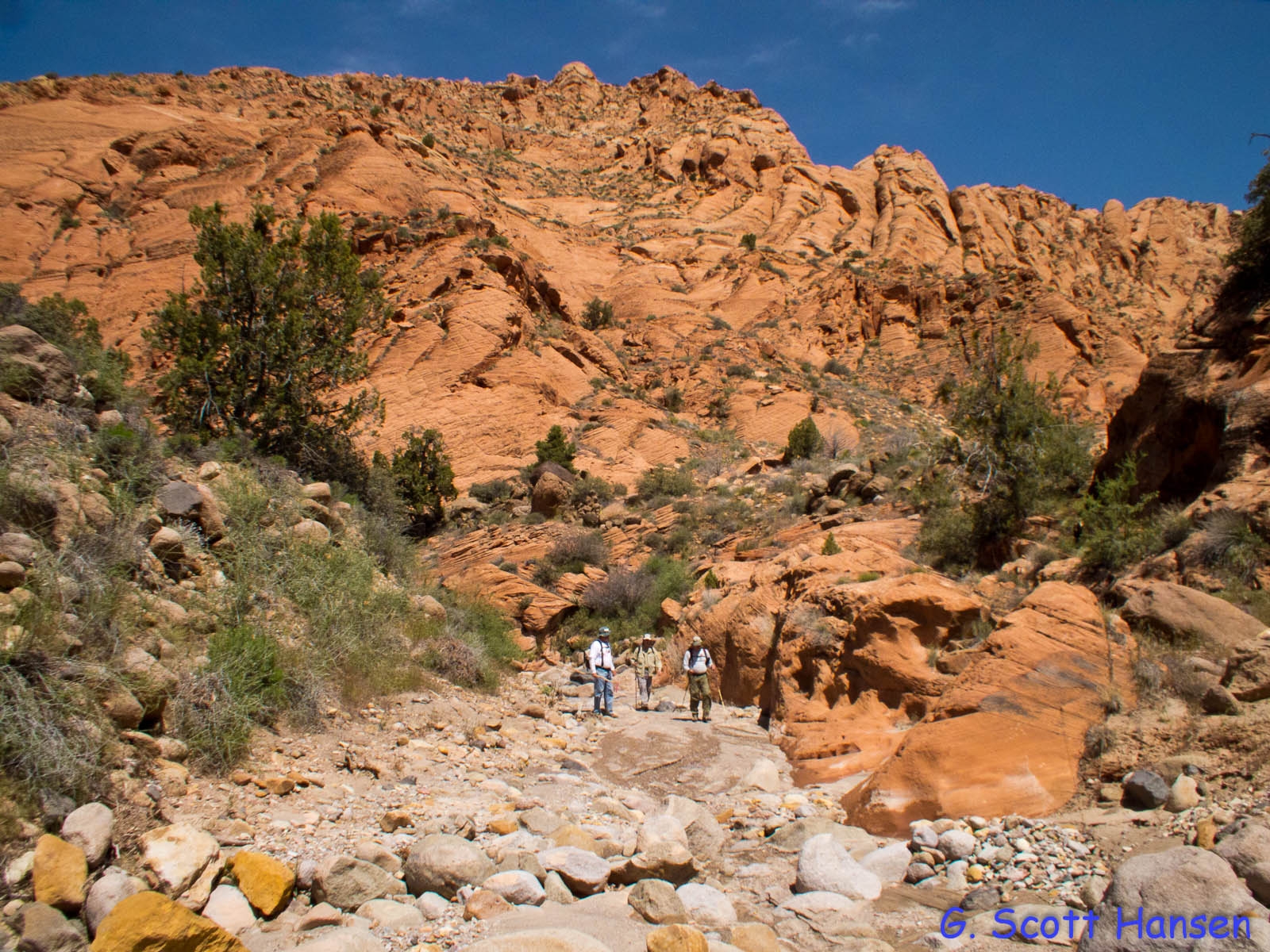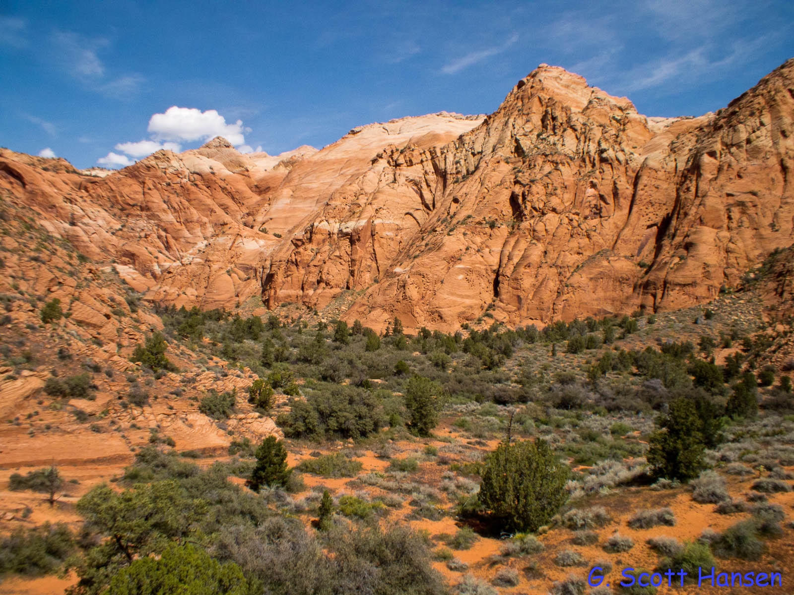 - Moving out of the wash bottoms to upland areas provides spectacular back country scenery like this array of Navajo sandstone peaks.