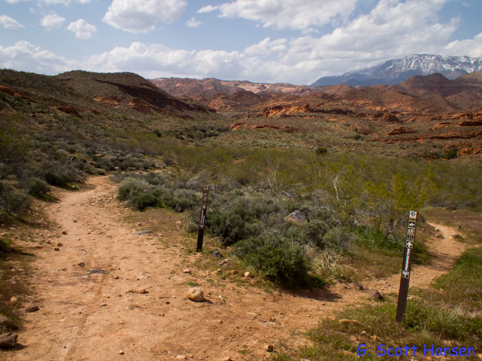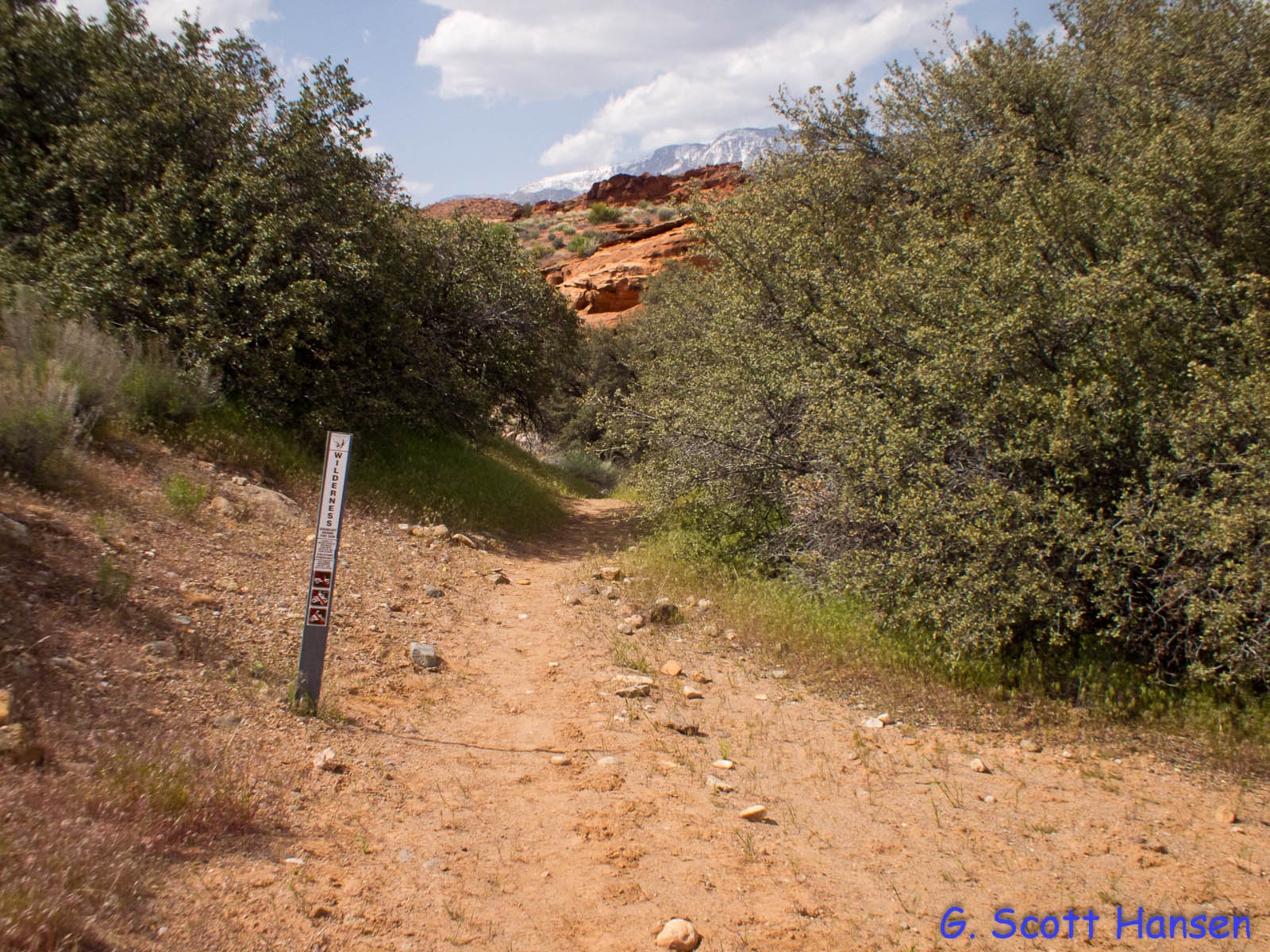 The Cottonwood Canyon trail is one of the most scenic trails in the RCDR. This difficult (length, bolder-hopping) trail/route extends about 7.8 miles from the Danish Ranch Road on the Dixie National Forest to the Cottonwood Trailhead off I-15 with an elevation loss of about 1300 feet and total elevation change of about 1400 feet. The trail/route is almost entirely in the Cottonwood Canyon Wilderness Area and is unmarked except for the short section outside the Wilderness area. A GPS unit is very helpful in the upper sections.