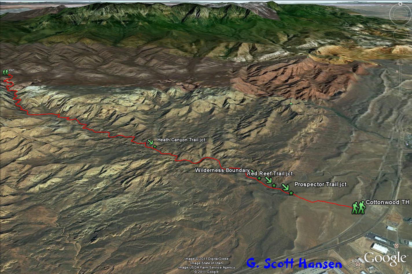- Cottonwood Canyon trail parallels the Prospector trail to the north until the Prospector trail splits off to the right. Cottonwood Canyon continues to the left.