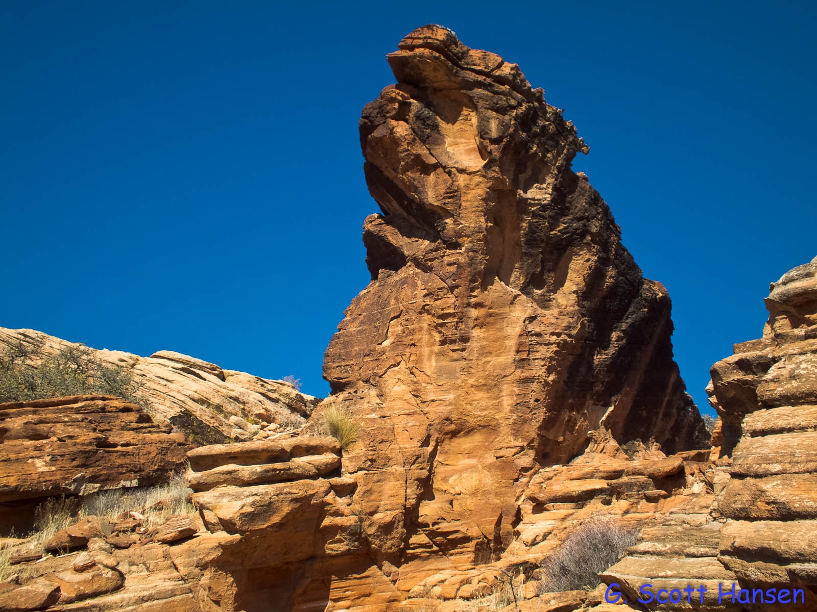 - Numerous interesting red rock formations occur adjacent to the trail. This one appears as a howling coyote to some visitors.