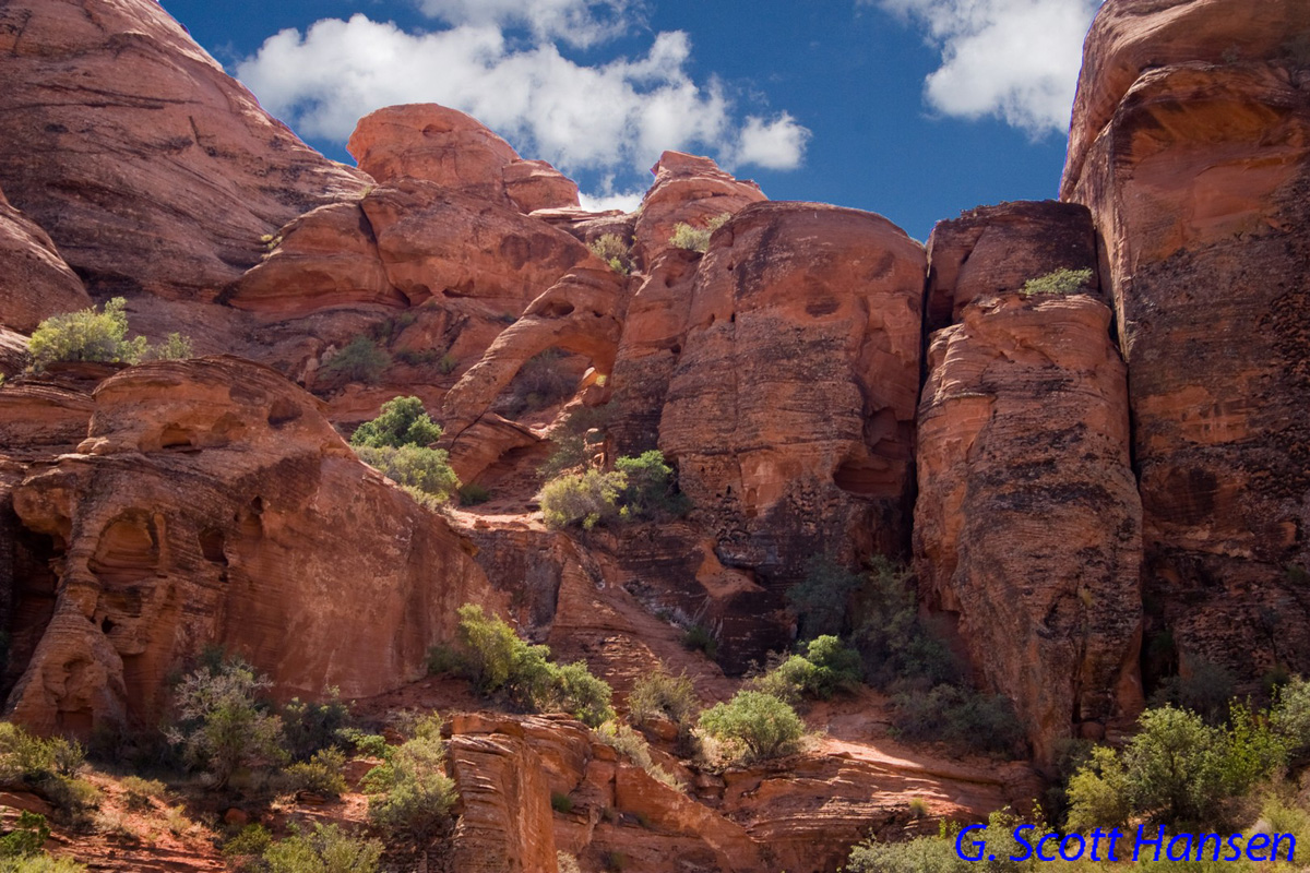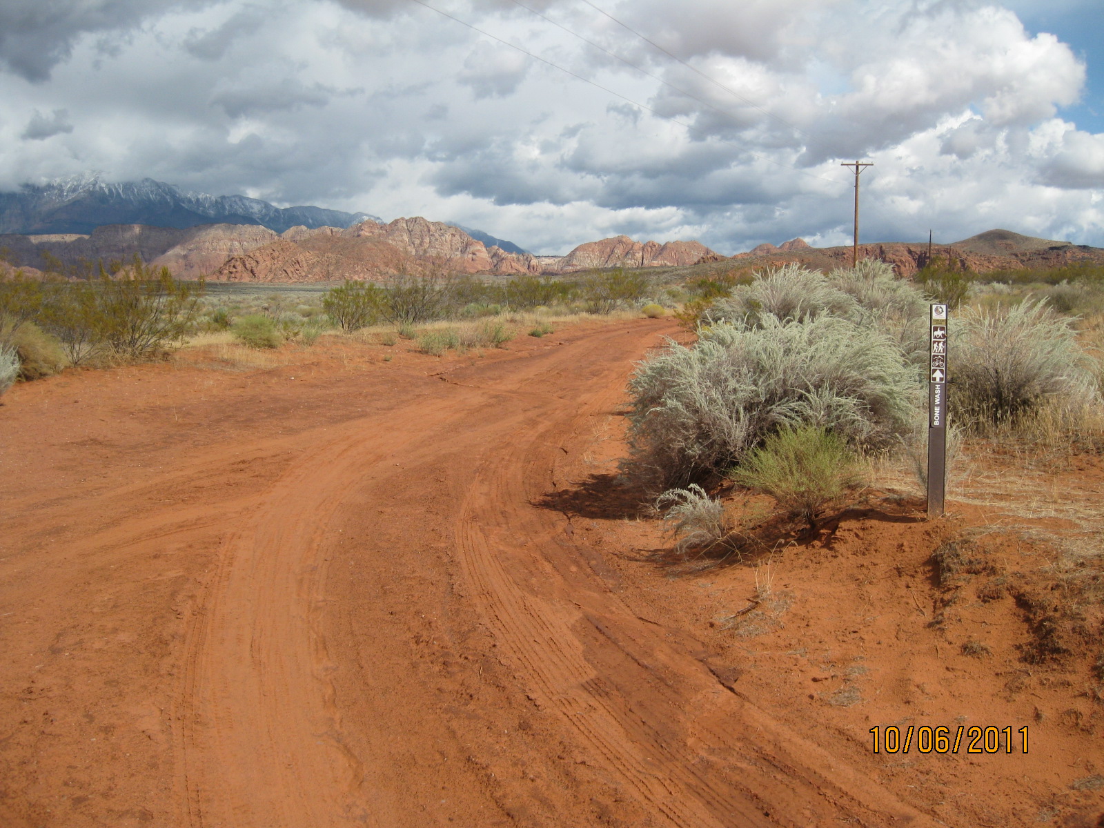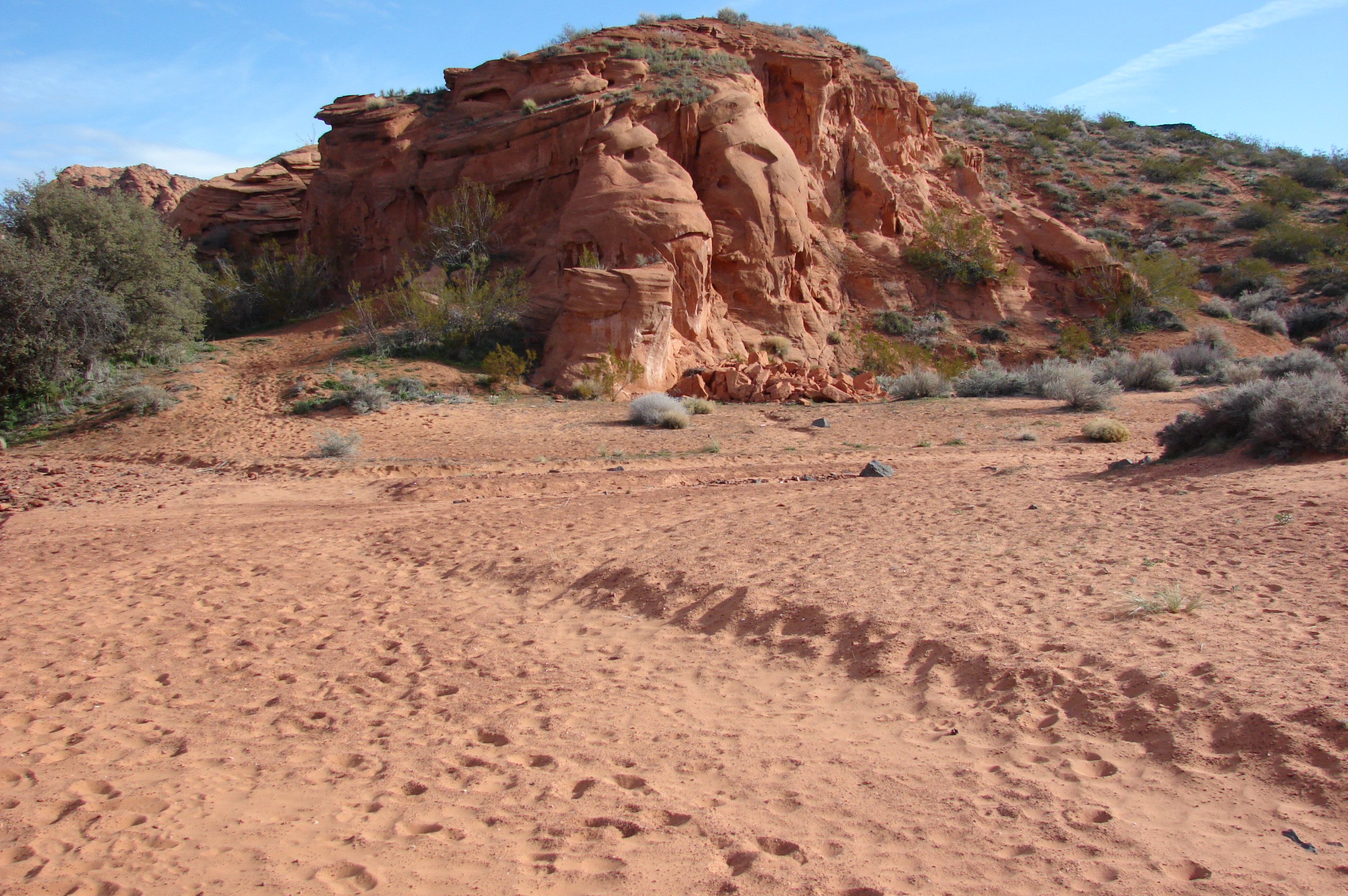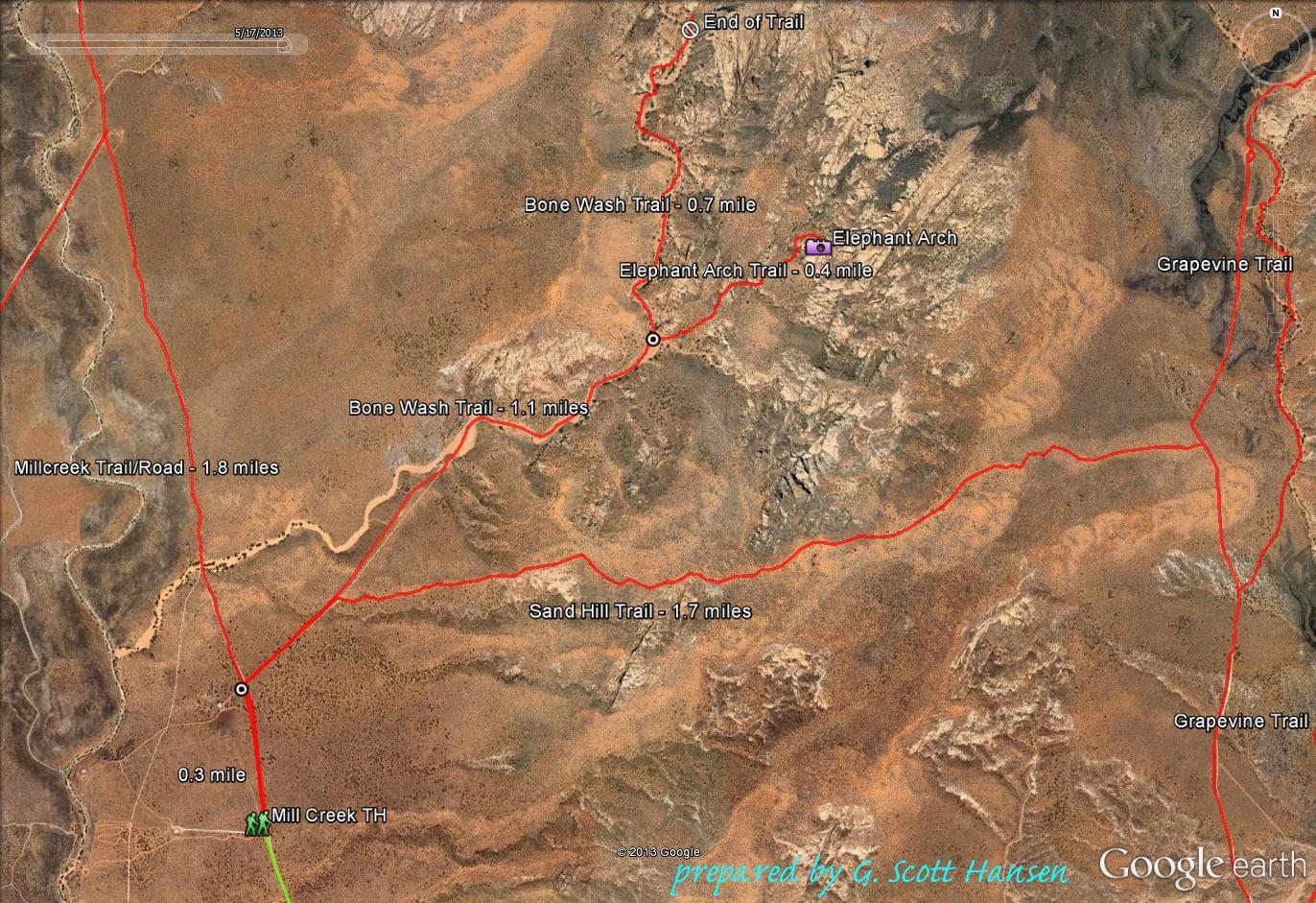 This popular route is used by hikers and equestrians alike to reach a delightful arch hidden high in the red rock formations in the Mill Creek area north of Washington City, Utah.  Starting at the Mill Creek trailhead, follow the sandy, 2-track Mill Creek trail a short distance to the reconfigured Bone Wash trail junction (0.3 mile).  Turn to the right to follow a power-line road or a parallel, sandy trail, to the junction where it joins Bone Wash just past a city pump station. The route then follows the very sandy Bone Wash trail about 0.5 mile to the junction of the Elephant Arch trail. This single-track, mostly sandy Elephant Arch trail climbs about 70 feet before dropping to follow the wash to below the Arch (about 0.4 mile).   Equestrians enjoy this route which is well-suited for horses.  Hikers, on the other hand, will find the deep, soft sand in Bone Wash to be laborious except after occasional precipitation which firms the sand up a bit.  Bikers will find all of the Bone Wash and portions of the Elephant Arch trail to be nearly impossible to traverse on their bikes.  Interesting red rock formations are encountered along the latter portions of the trails, culminating in the beautiful Elephant Arch hidden behind one of the more prominent peaks at trail’s end.  The hike or ride to the arch provides total quiet except for the occasional screech of a nesting hawk or the call of desert bird.  The total elevation gain is about 180 feet and the total elevation change up and down for either route is about 300 feet.  Total distance one way is about 2 ½ miles which can be hiked in 3 hours or less depending on time spent exploring at the arch.  The route is rated easy for equestrians and of moderate difficulty for hikers due to the soft sand.  The trail lies entirely across lands currently administered by the Utah School and Institutional Trust Lands Administration (SITLA).