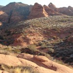 This popular route is used by hikers and equestrians alike to reach a delightful arch hidden high in the red rock formations in the Mill Creek area north of Washington City, Utah. Starting at the Mill Creek trailhead, follow the sandy, 2-track Mill Creek trail a short distance to the reconfigured Bone Wash trail junction (0.3 mile). Turn to the right to follow a power-line road or a parallel, sandy trail, to the junction where it joins Bone Wash just past a city pump station. The route then follows the very sandy Bone Wash trail about 0.5 mile to the junction of the Elephant Arch trail. This single-track, mostly sandy Elephant Arch trail climbs about 70 feet before dropping to follow the wash to below the Arch (about 0.4 mile). Equestrians enjoy this route which is well-suited for horses. Hikers, on the other hand, will find the deep, soft sand in Bone Wash to be laborious except after occasional precipitation which firms the sand up a bit. Bikers will find all of the Bone Wash and portions of the Elephant Arch trail to be nearly impossible to traverse on their bikes. Interesting red rock formations are encountered along the latter portions of the trails, culminating in the beautiful Elephant Arch hidden behind one of the more prominent peaks at trail’s end. The hike or ride to the arch provides total quiet except for the occasional screech of a nesting hawk or the call of desert bird. The total elevation gain is about 180 feet and the total elevation change up and down for either route is about 300 feet. Total distance one way is about 2 ½ miles which can be hiked in 3 hours or less depending on time spent exploring at the arch. The route is rated easy for equestrians and of moderate difficulty for hikers due to the soft sand. The trail lies entirely across lands currently administered by the Utah School and Institutional Trust Lands Administration (SITLA).