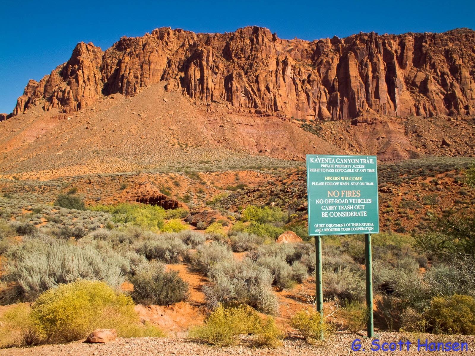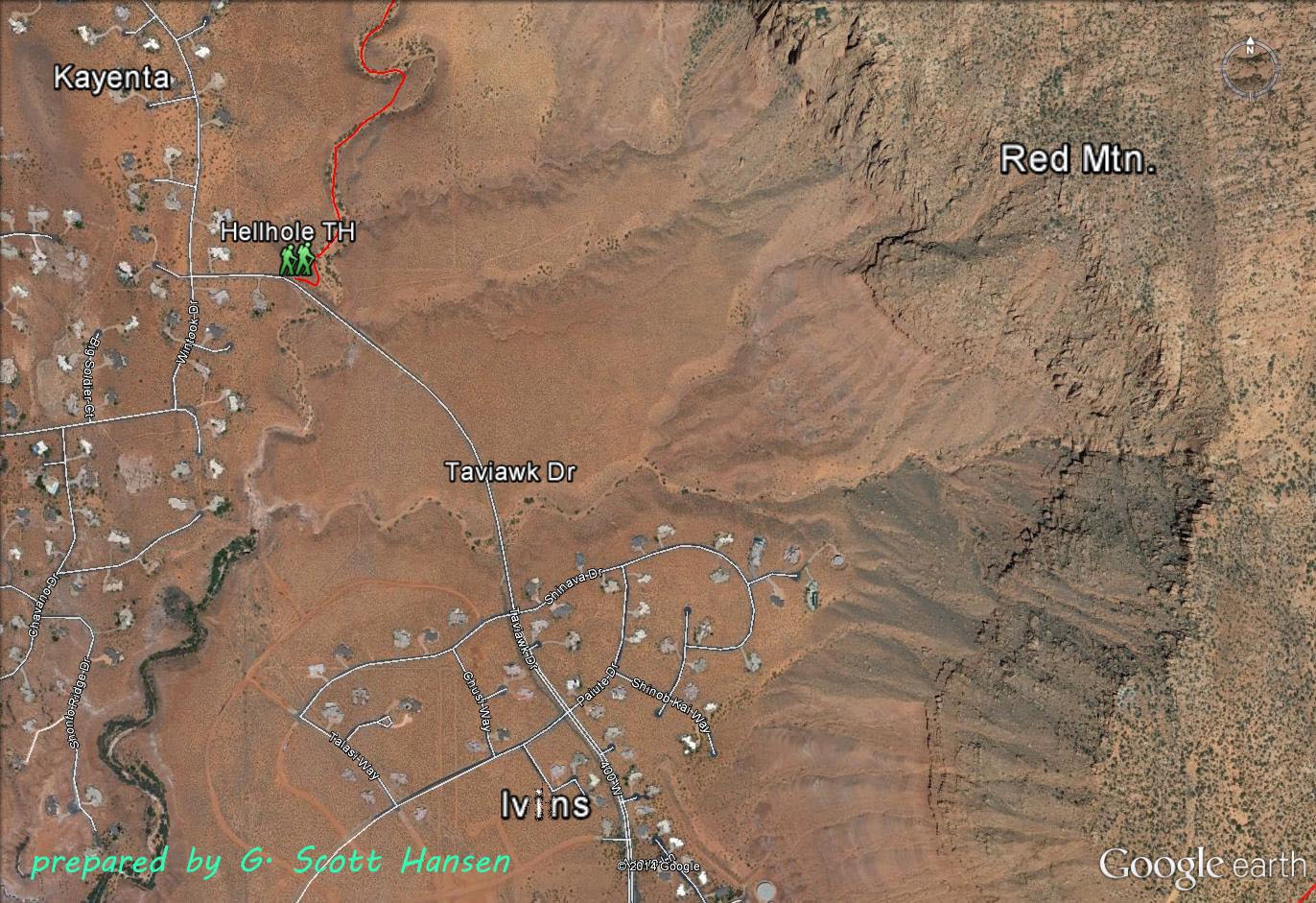 The Hellhole trailhead is located on private ground in the Kayenta development in Ivins, Utah and is open to use by responsible members of the public. Access to the trailhead can be gained from the St. George metropolitan area via Snow Canyon Parkway and Center Street in Ivins (or Sunset Boulevard- Santa Clara Boulevard-Old Hwy 91) to 400 West in Ivins. Visitors turn right on 400 West and travel north till the road becomes Taviawk Drive. Proceed north on Taviawk about 1 mile from the traffic circle at Center Street and park on the south side of the road in the concrete drain area (signed for visitors) above the wash. Only two vehicles are accommodated here. Any other visitors may find limited pullover parking along the road on the north side east of the wash. Follow the signs to drop down into the wash on the northwest side of the road and wash intersection. No other facilities are provided.