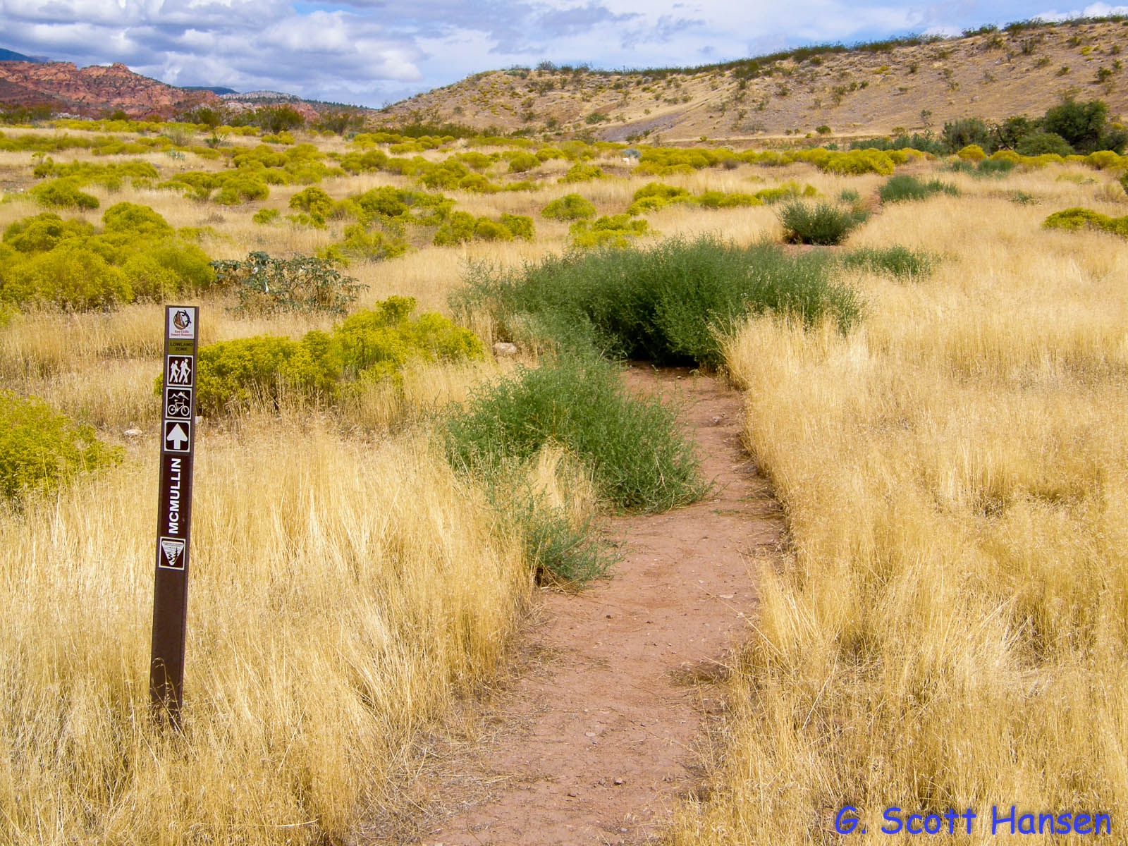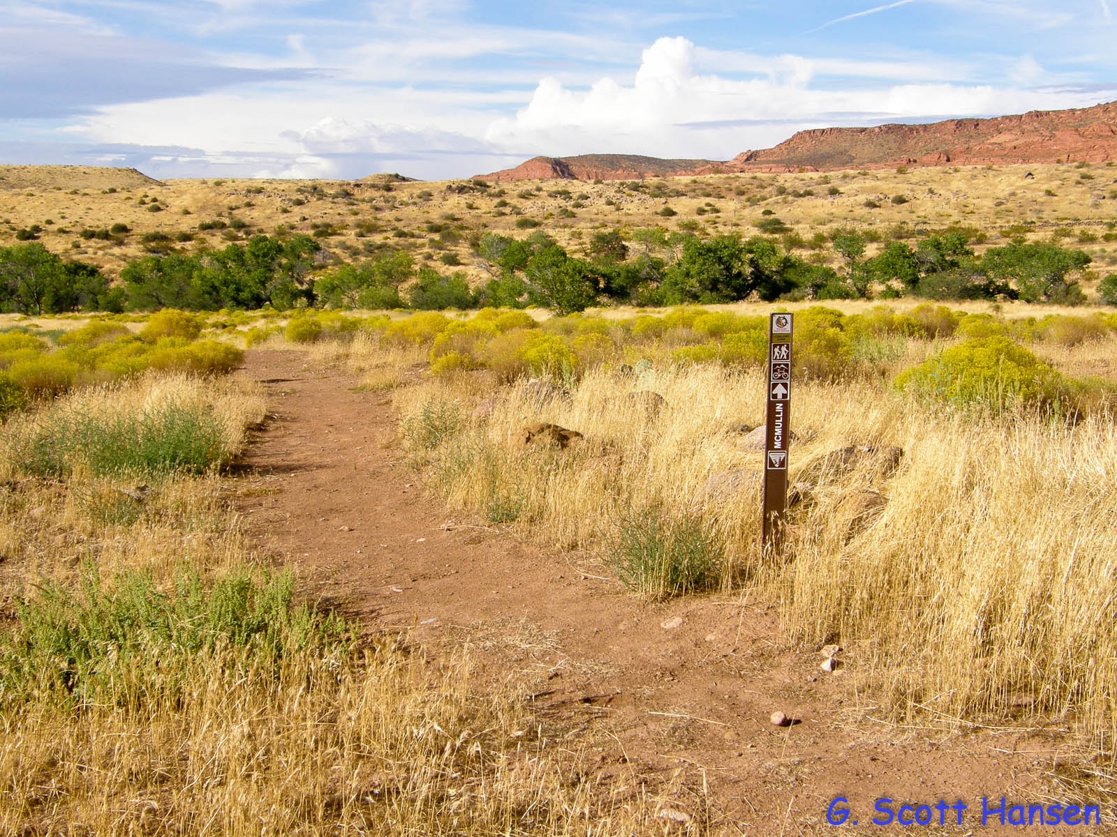 The McMullin trail is a short, 0.1 mile connector between the Cordura and White Reef trails adjacent to the White Reef trailhead at the east end and the Harrisburg ruins on the west end. It is an easy, single track, dirt trail with no elevation change. The trail is strictly for visitor convenience and is open to hikers, bikers, and equestrians.