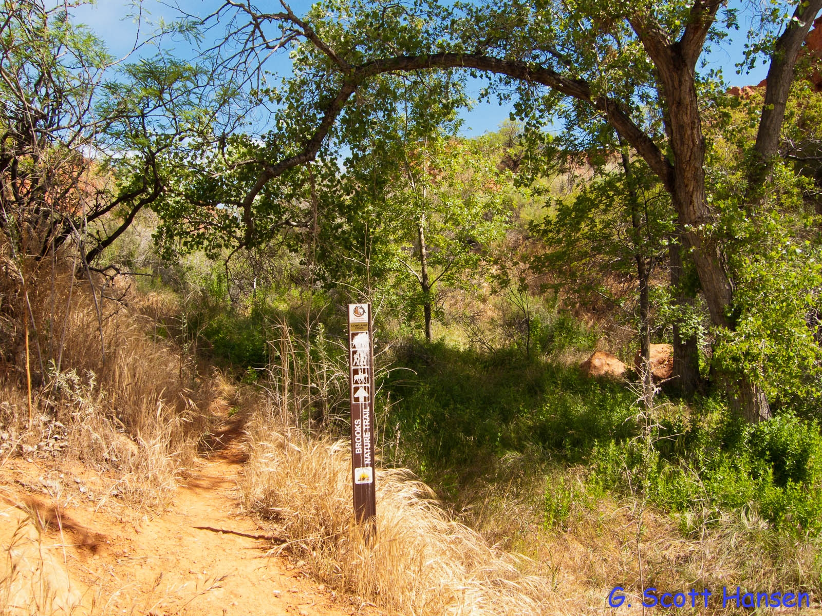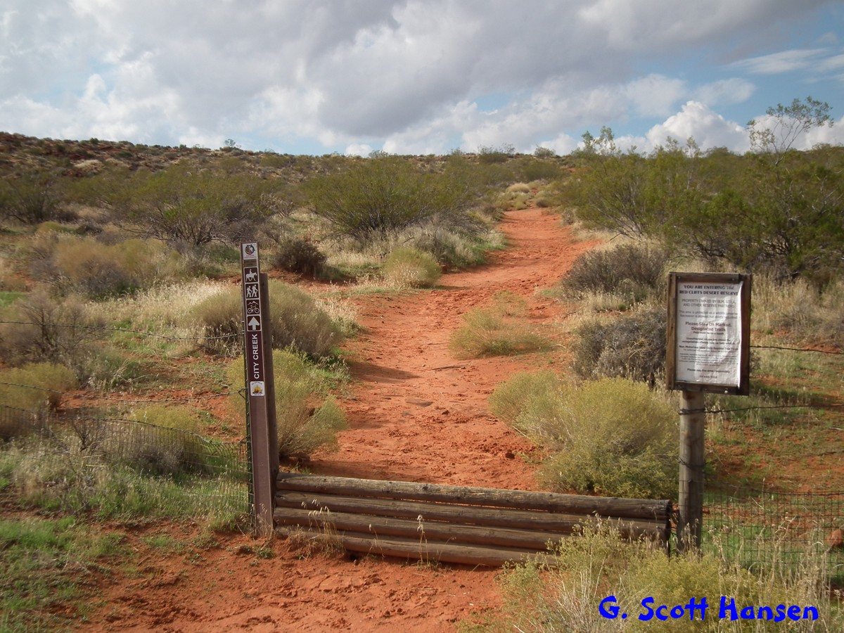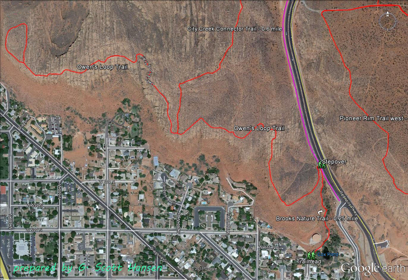 1. The Brooks Nature Trail begins at a small city park and trailhead at the north end of Main Street in St. George. From this trailhead the round trip hike is about 3.5miles in length witha net elevation gain one-way of about 330 feet and a total round trip up and down elevation change of about 2080 feet. The trail merges with the Owens Loop trail 0.3 miles from the trailhead. From the park, it is a single track, mostly dirt path to where it joins the City Creek connector trail from the Pioneer Rim trailhead.