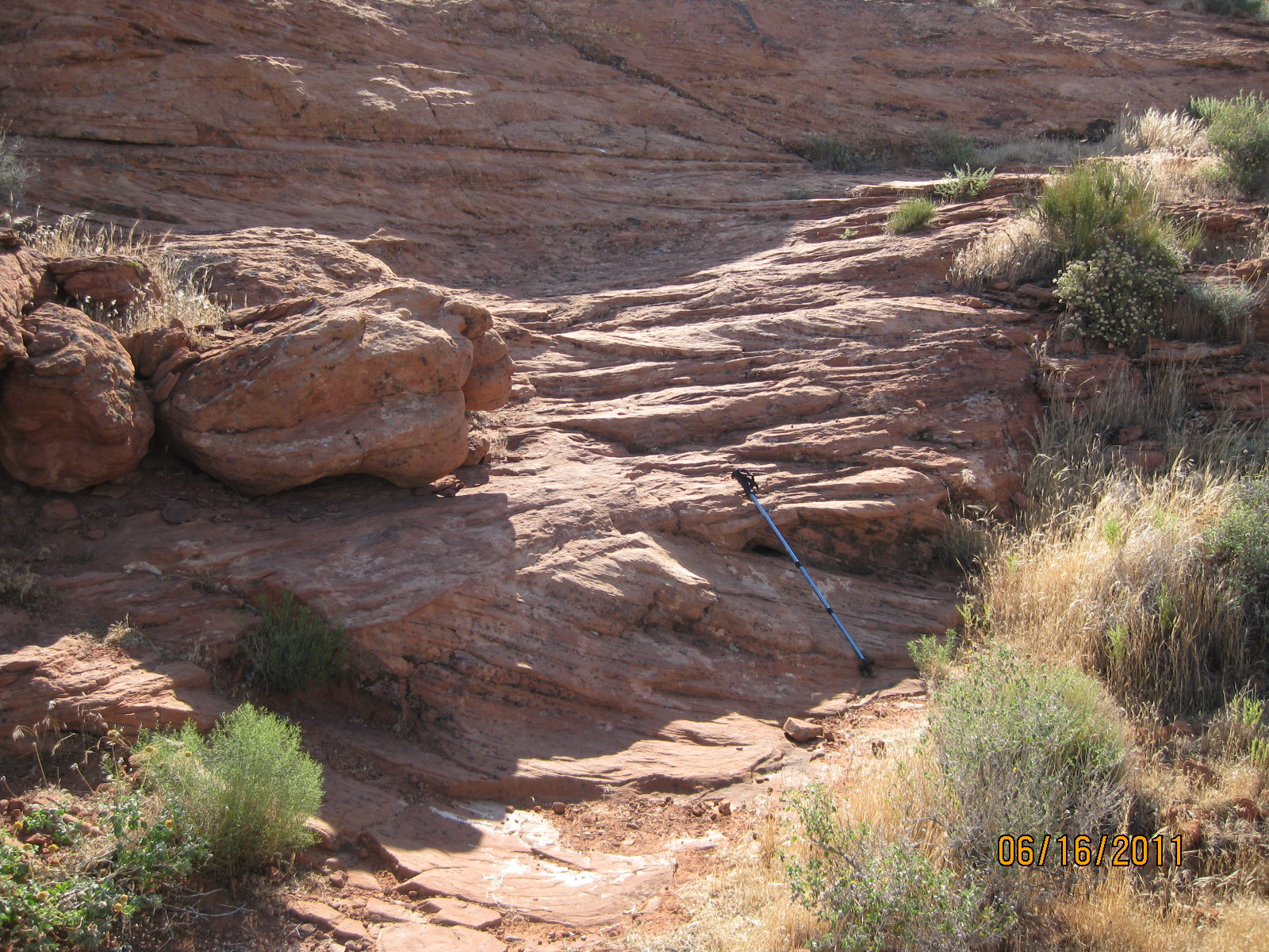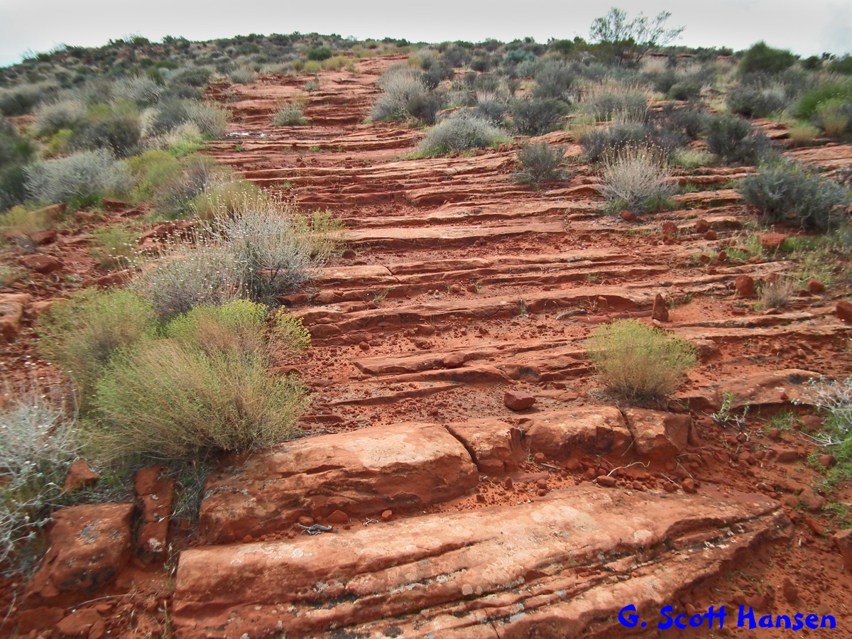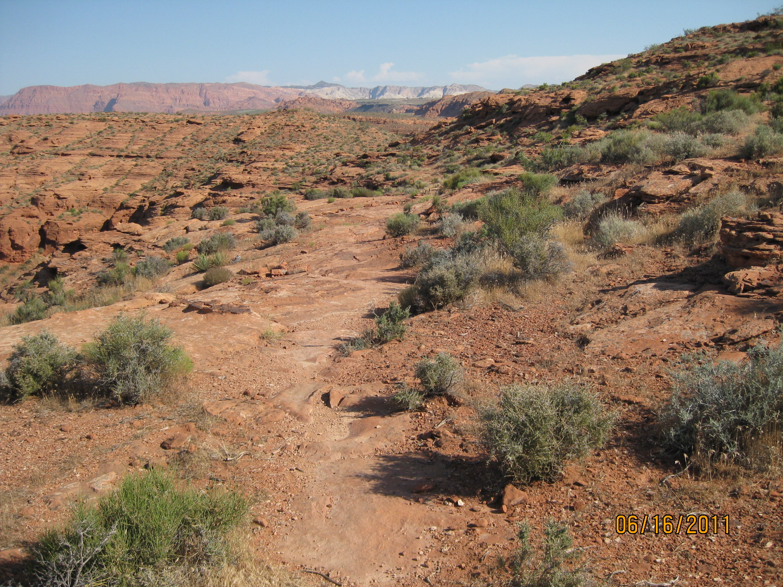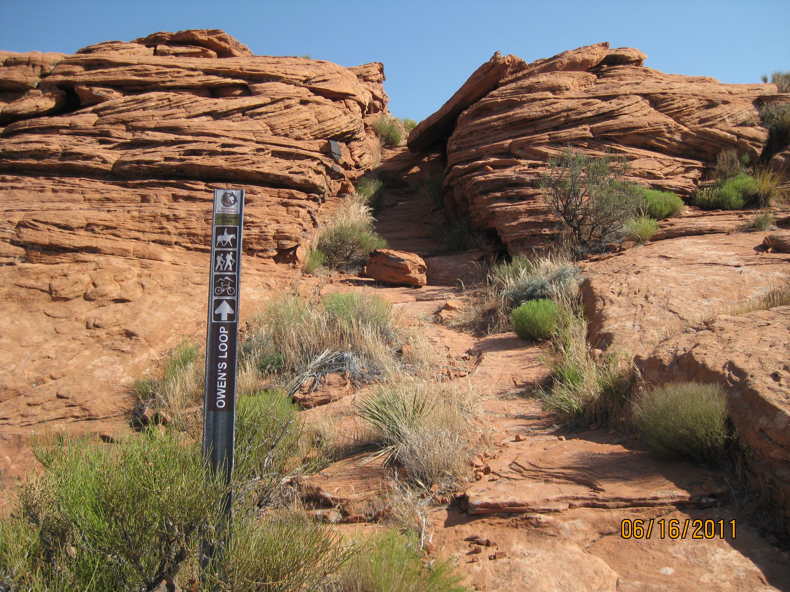 From the junction with the City Creek Trail, the Owens Loop Trail continues west to the loop overlooks. The trail at this point is mostly slick-rock with interesting red rock formations and a few short drop-offs. This trail section contains a few areas with sloping, rocky stretches that can pose problems for less capable hikers and bikers and which cause it to be rated as moderately difficult. The trail lies primarily on lands owned by the City of St. George and partly on lands administered by BLM within the Red Cliffs NCA.