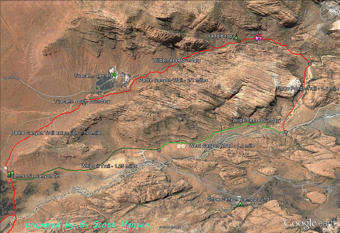 - This map shows the Padre Canyon trail including its south extension to the Johnson Canyon trailhead parking area. It also shows linkages with trails inside Snow Canyon State Park to form an optional loop hike.