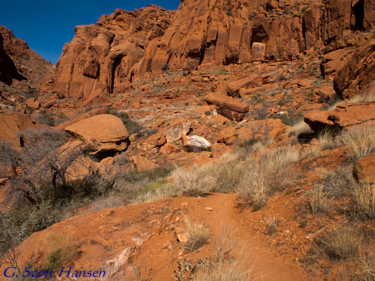 - The trail winds underneath these red sandstone cliffs as it approaches the Tuacahn property.