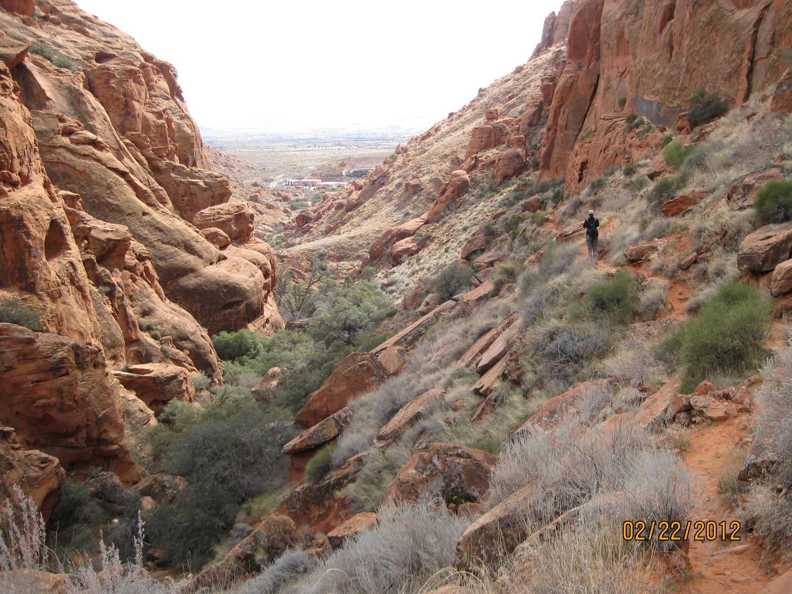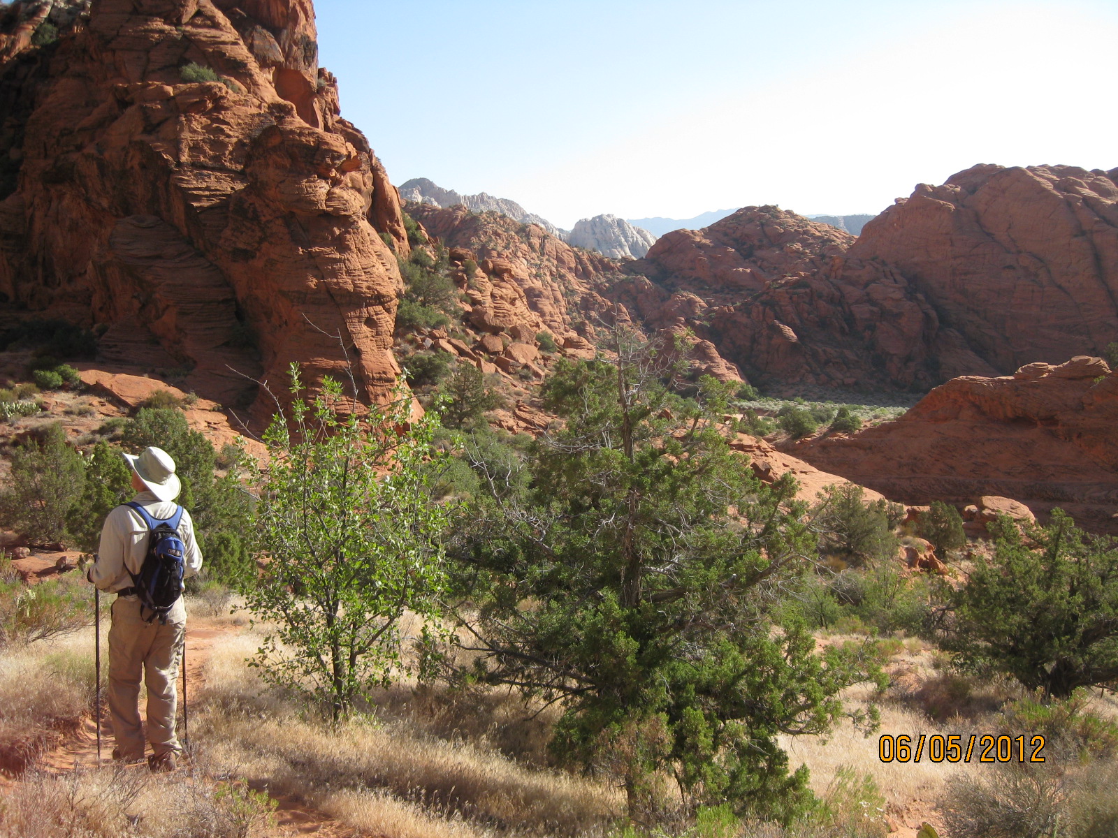 - The trail leads through a maze of red sandstone formations with distant views into the white sandstone areas of Snow Canyon State Park.