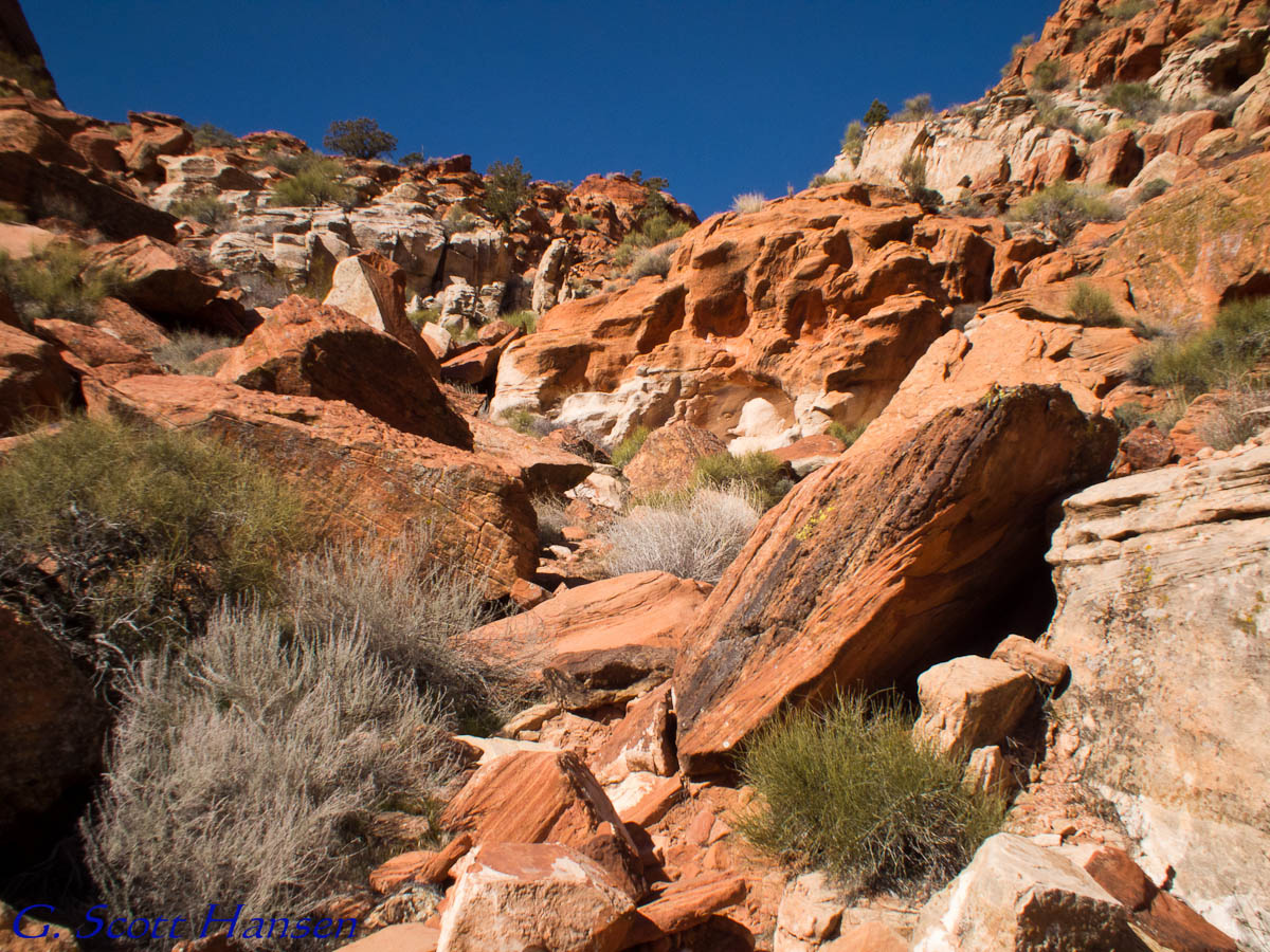 This strenuous trail is one of the most interesting and scenic trails in the Red Cliffs Desert Reserve. Many visitors access the trail from a pull-over just outside the south Tuacahn Center main gate on Tuacahn Drive. From the pullover, the trail can be reached by proceeding along the fence line through the adjacent wash to the east. Visitors can also access the trail from the Tuacahn parking lot via a small connector trail at the northeast portion of the facility. The marked trail runs above the east bank of the wash and continues through private property owned by Tuacahn and lands administered by Snow Canyon State Park. This interesting part of the trail lies outside of the park’s fee area and does not require a permit. Visitors are asked to respectfully comply with the requirements posted on various signs while entering and using the trail through the Tuacahn property and to avoid crossing through the equipment wareyard and animal corrals. Once past the Tuacahn facility, the trail crosses lands administered by BLM inside the Red Cliffs NCA and the Red Mountain Wilderness Area. From the Tuacahn gate the trail winds about 1½ miles as it climbs nearly 600 feet to the upper saddle. The trail follows a foot path that varies from packed dirt to very rocky with a good deal of boulder hopping, especially as the trail approaches the saddle. Hikers will find the trail challenging but beautiful and awe-inspiring as it meanders through the drainage below awesome red cliffs with spectacular views to both the south and the north. A small landslide ¾ of the way up the canyon eradicated a short portion of the trail and requires some scrambling to get over it and to return to the main user trail. Once over the saddle from the Tuacahn side, visitors will enter a scenic wonderland of remote peaks and cliffs of red and white sandstone and extraordinary rock formations. From the saddle, the trail descends ¾ of a mile via a dirt, rocky, and slickrock path to a wash near the Three Ponds trail junction. Elevation loss from the saddle is about 230 feet with a total elevation change of about 300 feet. User cairns will help hikers stay on the designated route through the slickrock sections. No signs are provided in the wilderness area portions of the trail. Observant visitors who explore off the main trail on this side of the saddle may find unique formations including some excellent arches.