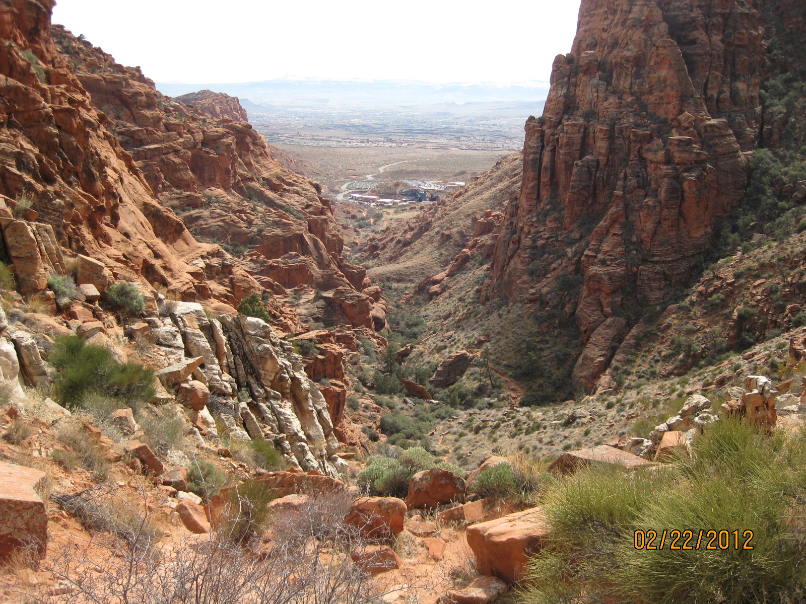 - Once on the saddle, visitors can look to the south for a spectacular view of the canyon leading back to the Tuacahn facility and the metropolitan area in the distance.