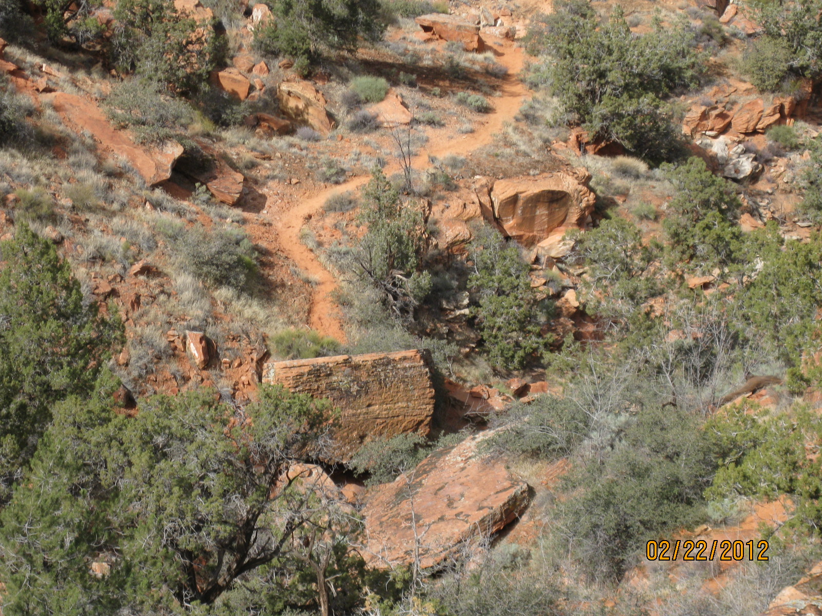 - The trail winds along rocky ledges well above a wash bottom which carries water through portions of the year.