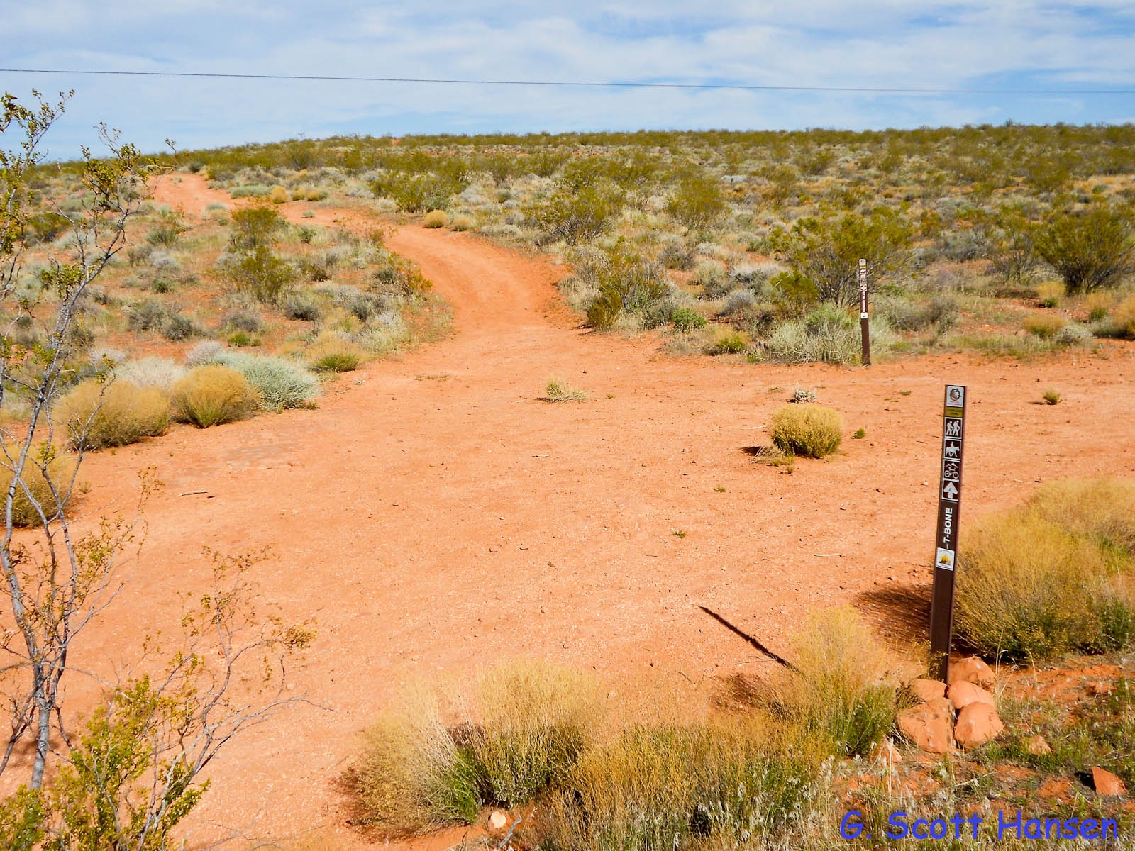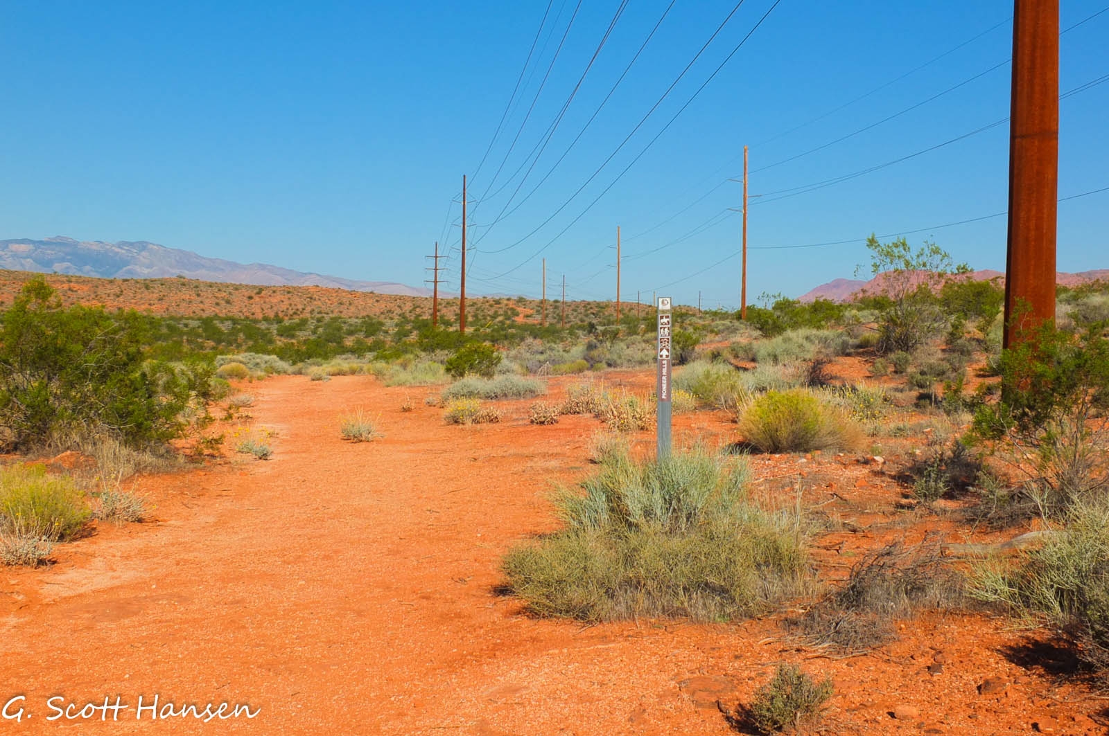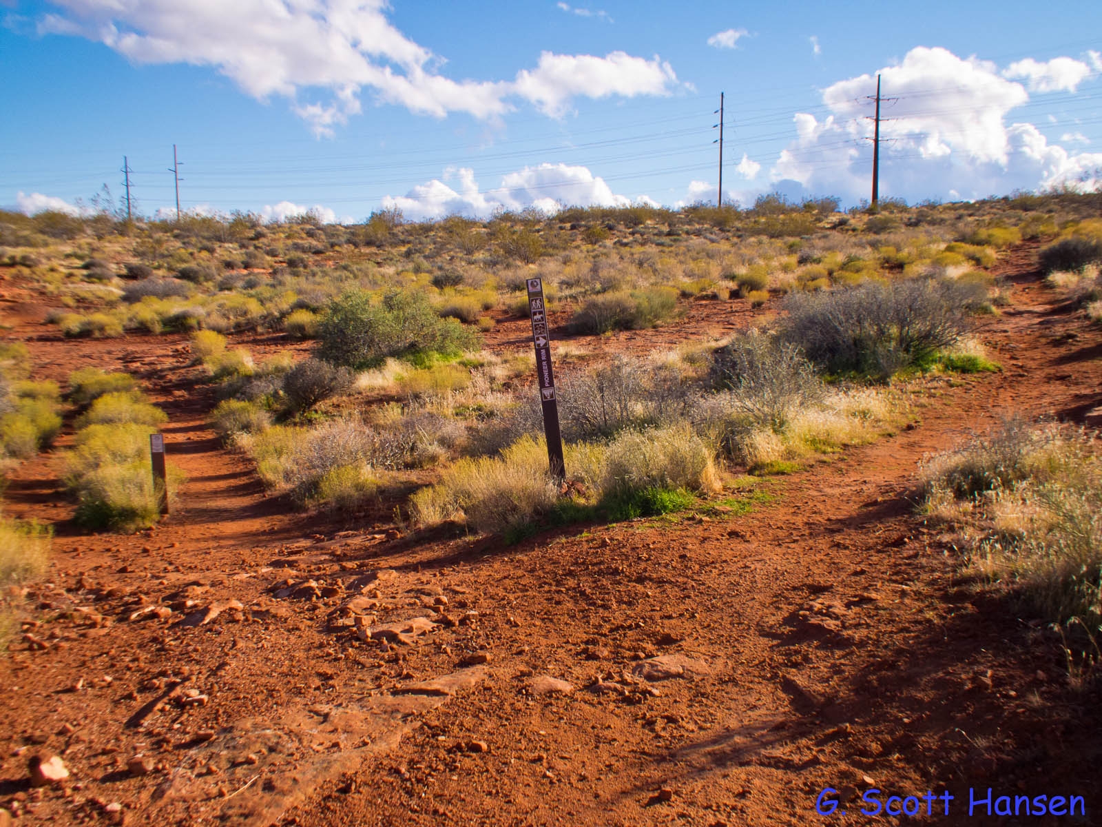 The Pioneer Hills trail is most often accessed from the Pioneer Hills trailhead off the Red Hills Parkway north of St. George City’s metro area. The trailhead provides ample parking for numerous vehicles including trailers. Visitors take the relatively easy east-bound trail link up hill to a powerline road which runs about 0.7 miles to the Junction with the T-Bone trail. Popular with bikers, hikers, runners, and equestrians, this wide two-track makes a nice 2.5 mile loop when linked with the T-Bone south and Pioneer Rim west trail segments to come back around to the trailhead. Total elevation change on the loop is about 580 feet. The trail and the extended loop lie wholly across lands owned by the City of St. George in the semi-primitive Pioneer Park.