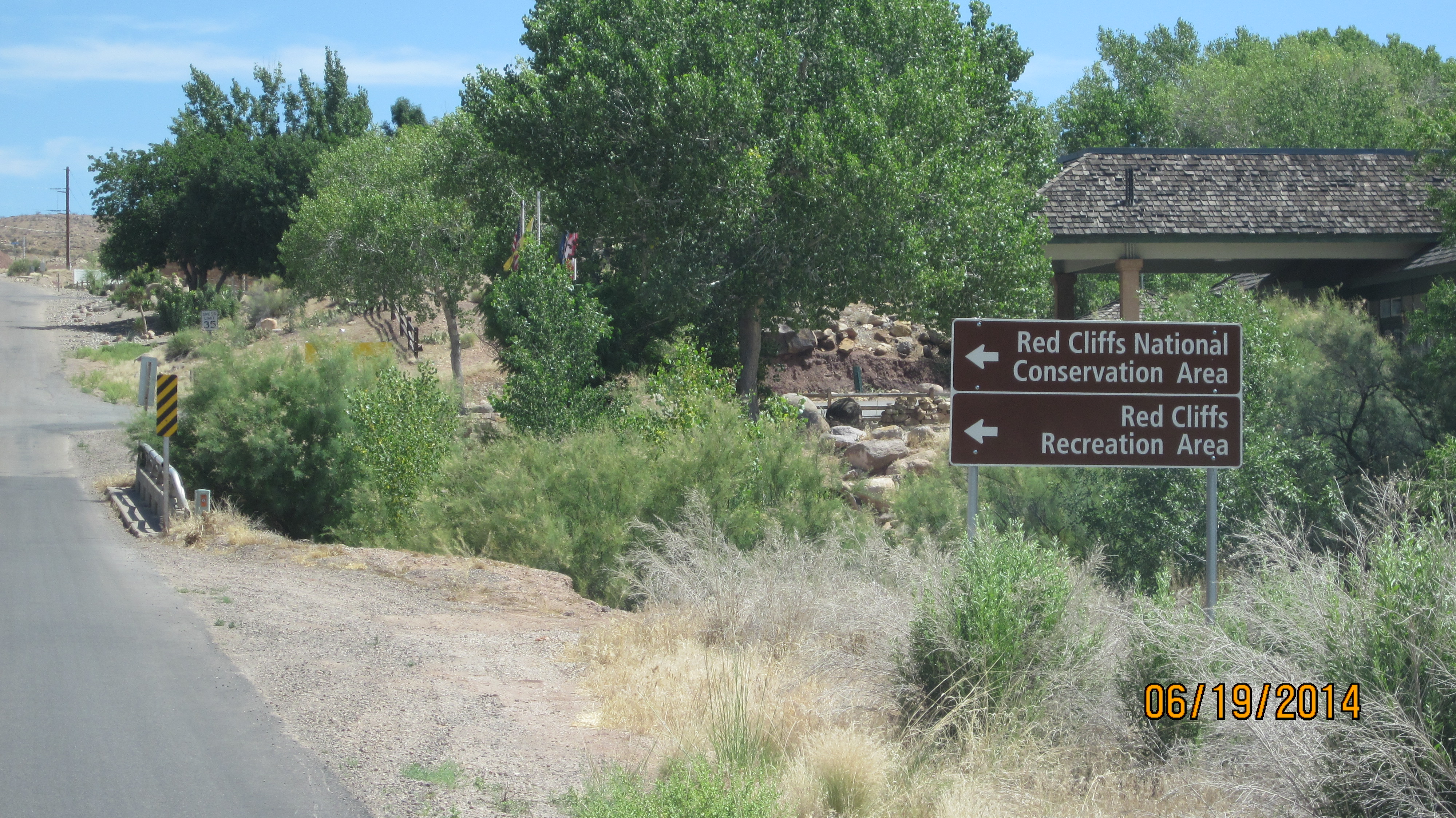 Parking in the Red Cliffs Campground for day use activities is provided on a limited basis (30 spaces spread throughout the camp area) and requires a daily permit fee from a self-serve station at the entry point. No trailers are accommodated in these sites. The popular area is overwhelmed on spring weekends, particularly at Easter time and may require extensive waiting times for a vacant spot. No parking is allowed along the entrance roadway. This trailhead is reached by north-bound travelers on I-15 by taking Exit 22 towards the Town of Leeds and immediately making a sharp right turn back to the south on Old Hwy 91. Southbound travelers on I-15 should take Exit 23 into Leeds and proceed south through town. From the Exit 22 turnoff, visitors travel just under 2 miles on the paved frontage road to the small, historic RV community of Harrisburg. Turn right at the brown sign that says Red Cliffs Recreation Area and travel on a narrow paved section through two I-15 underpasses. Turn left almost immediately at the “T” intersection and follow the signs about 1 mile to the Recreation Site. Travelers coming from the east out of Hurricane City or Zion National Park may take State Hwy 9 to the traffic signal serving the Washington County Regional Park on the south and the Quail Creek Reservoir and State Park to the north. Turn right at the signal and follow the paved scenic road past the reservoir all the way around to the west to reach Old Hwy 91. Turn right on the old highway towards a KOA facility (and the historic Harrisburg area) and turn left shortly thereafter at the sign and paved underpass road described above. Out of this trailhead area, visitors may hike the popular Red Reef trail along Quail Creek into the Cottonwood Canyon wilderness area or hike/ride along14 different trails in the Recreation Area below the spectacular red cliffs for which the area is named. Red rock canyons, dinosaur tracks, Anasazi pit houses, and historic homesteads are all accessible out of this trailhead. Water, picnic areas, and restrooms are available in the campground as are 11 camp sites for overnight visitors (separate fee). Day use patrons may also choose to park their vehicles at the more expansive White Reef trailhead located just west of the I-15 underpasses to access many of the trails served by both trailheads. Both sites are administered by the BLM within the Red Cliffs National Conservation Area.