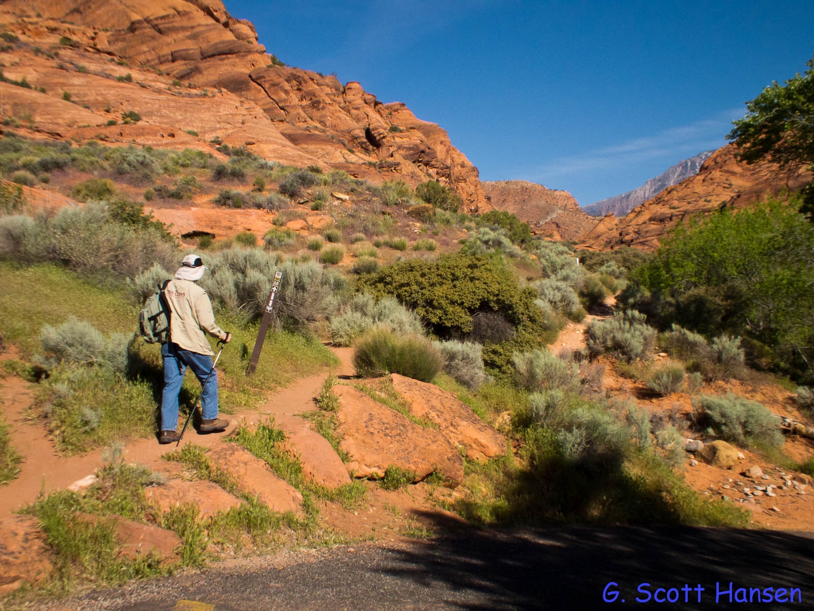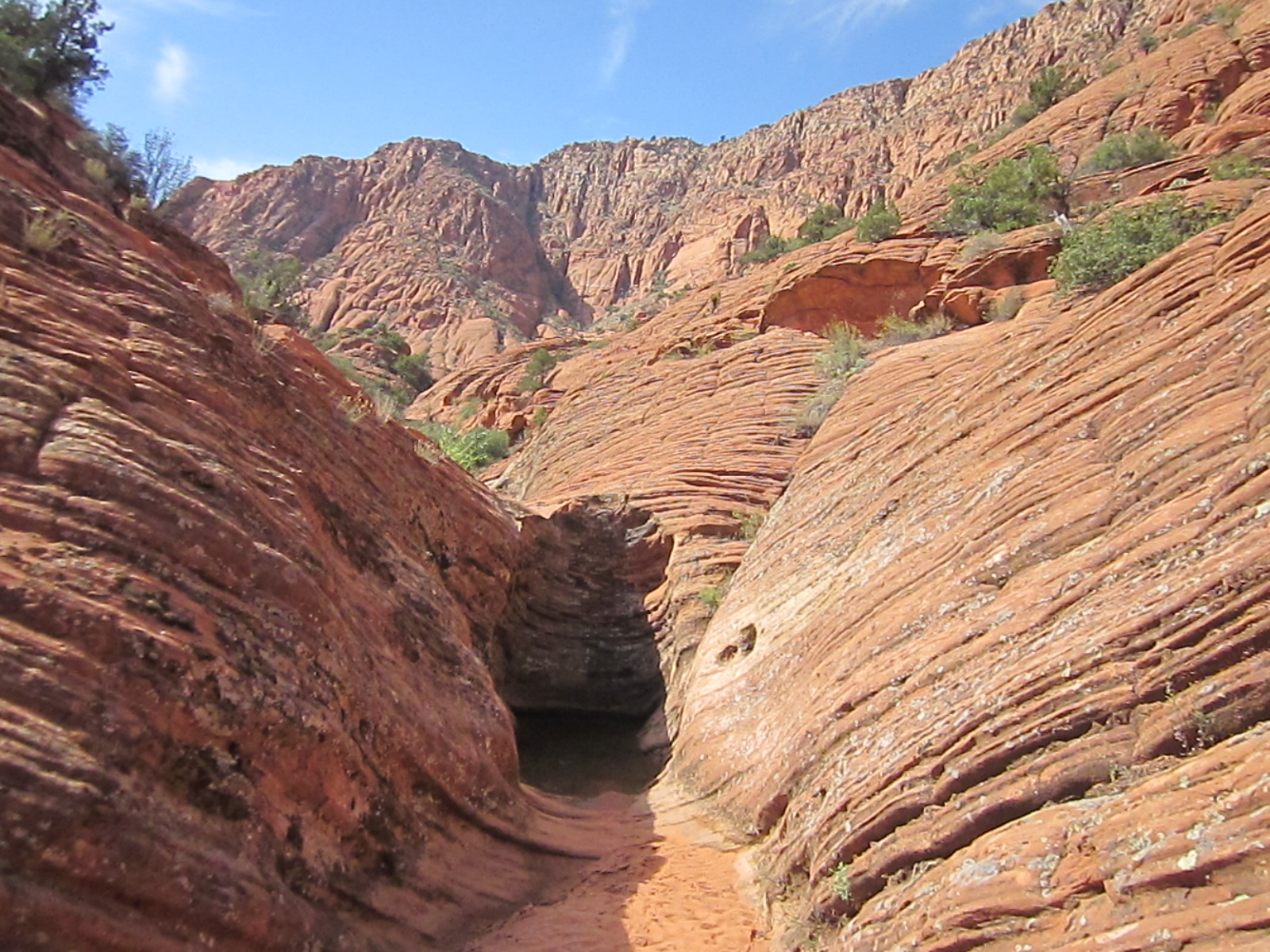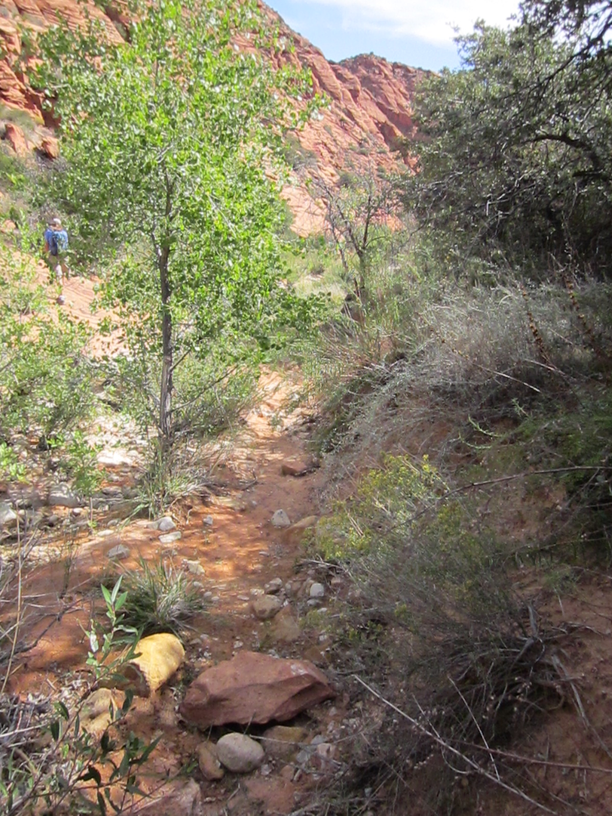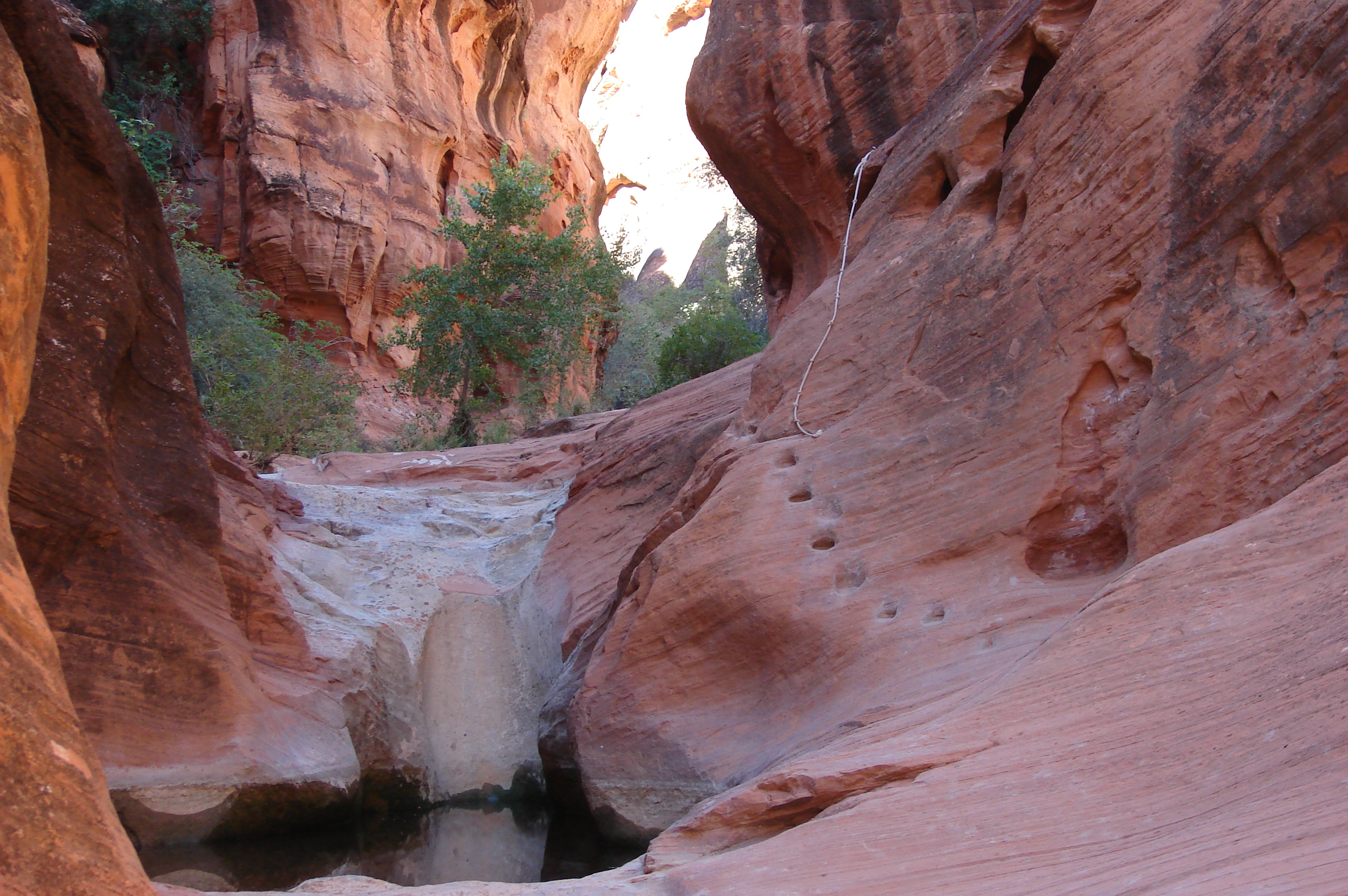 The Red Reef trail is comprised of three segments, each very different from the others and with very different user requirements.  The most popular segment starts out of the Bureau of Land Management’s Red Cliffs campground 1 mile west of Interstate 15 at Harrisburg.  This trail is relatively easy and used by large numbers of the general public during the spring and fall seasons when weather is pleasant. It follows the Quail Creek drainage out of the campground and enters a winding, beautiful red rock canyon with numerous opportunities for general recreation.  All but the first hundred yards or so are located in the Cottonwood Canyon wilderness area which is closed to bicycles.  Hikers will find the single track trail segment easy in most parts with some hilly spots until ½ mile up the canyon visitors must navigate around a large pool of water over an 8-foot sandstone wall with carved-out foot holds (locally called Moki steps) with assistance from an anchored rope.  It is unclear who, if anyone, maintains the security of the rope; thus, hikers use it at their own risk.  The pool is often used as a favorite swimming hole with jumpers, acting at their own risk.  Jumping or diving into pools along any portion of the creek is not recommended and can cause serious injury or worse due to shallow water and hidden obstacles.  From there the canyon continues up stream through a long slot and multiple dry falls, often filled with water during wet season or after rains.  The creek flows constantly during the spring season but often shuts down later in the year.  Hikers will get wet unless they choose somewhat difficult climbs above the drainage to circumvent the deepest pools.  This should only be done by persons knowledgeable of the safest routes.  At about 1½ miles from the campground trailhead, the designated trail route diverts to the left (south) up an unnamed side canyon at a spot that is not well marked other than by a user-created cairn.  This is the second segment.  This drainage will take visitors up to a high saddle and allow eventual access to the third and southern trail segment leading down to the Cottonwood trailhead.  The side canyon is less than 1 mile in length and involves numerous dry falls (sometimes referred to as pour-overs) with pools at their bottom that need to be circumvented within the steep, narrow walls of the canyon.  This will be an extreme challenge for many hikers who are not comfortable with steep slopes on red slickrock and who are uncomfortable with heights.  At a point about ¼ mile from the turn off, it is necessary to navigate a 30-foot narrow, vertical chimney with a single, user-installed rope to get beyond a large dry fall.  Use the rope at your own risk inasmuch as its safety and maintenance is unknown.  The climb requires physical dexterity, upper-body strength, and a cool mind, among other attributes helpful in a canyoneering environment.  It is highly recommended that this entire extreme but spectacular segment not be taken without a knowledgeable guide who has been through the canyon before.  An alternative, but undesignated, route used by a few hiking groups to the upper saddle involves taking the side canyon to the left immediately after the Moki steps at the large pool.  This canyon, however, involves significant rock scrambling over large boulders throughout its length and is considered dangerous by agency personnel and hiking guides. This route has contributed to a large number of injuries over the years.  It is considered an extreme segment and is not recommended for the general public.