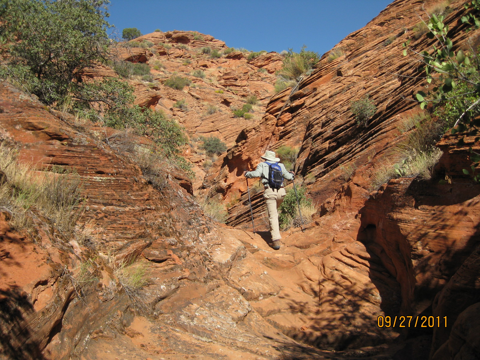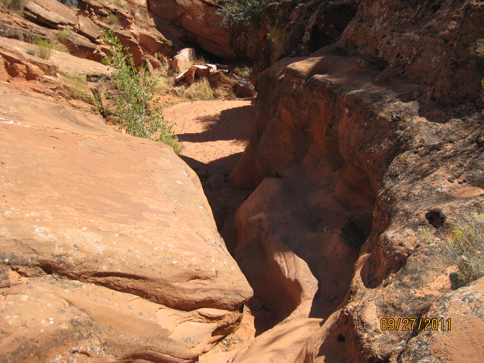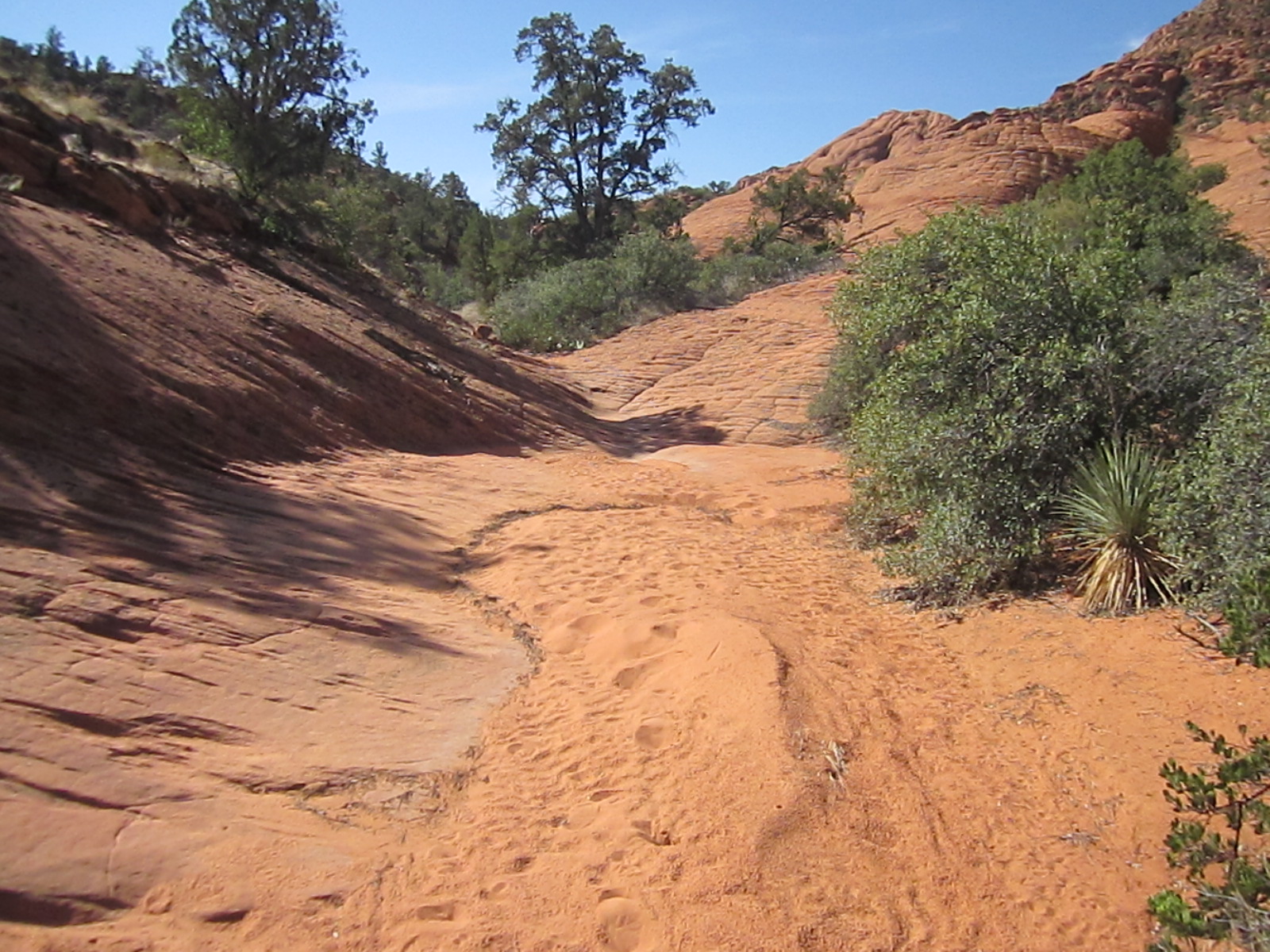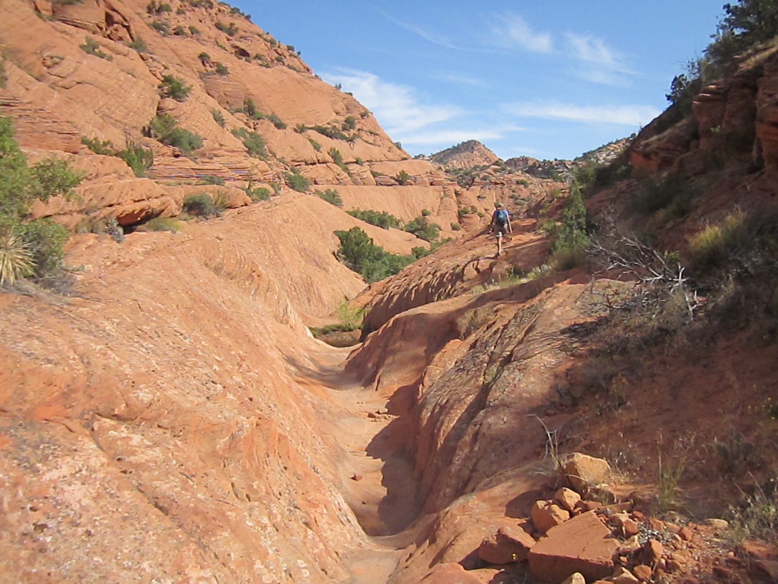 The Red Reef trail is comprised of three segments, each very different from the others and with very different user requirements.  The most popular segment starts out of the Bureau of Land Management’s Red Cliffs campground 1 mile west of Interstate 15 at Harrisburg.  This trail is relatively easy and used by large numbers of the general public during the spring and fall seasons when weather is pleasant. It follows the Quail Creek drainage out of the campground and enters a winding, beautiful red rock canyon with numerous opportunities for general recreation.  All but the first hundred yards or so are located in the Cottonwood Canyon wilderness area which is closed to bicycles.  Hikers will find the single track trail segment easy in most parts with some hilly spots until ½ mile up the canyon visitors must navigate around a large pool of water over an 8-foot sandstone wall with carved-out foot holds (locally called Moki steps) with assistance from an anchored rope.  It is unclear who, if anyone, maintains the security of the rope; thus, hikers use it at their own risk.  The pool is often used as a favorite swimming hole with jumpers, acting at their own risk.  Jumping or diving into pools along any portion of the creek is not recommended and can cause serious injury or worse due to shallow water and hidden obstacles.  From there the canyon continues up stream through a long slot and multiple dry falls, often filled with water during wet season or after rains.  The creek flows constantly during the spring season but often shuts down later in the year.  Hikers will get wet unless they choose somewhat difficult climbs above the drainage to circumvent the deepest pools.  This should only be done by persons knowledgeable of the safest routes.  At about 1½ miles from the campground trailhead, the designated trail route diverts to the left (south) up an unnamed side canyon at a spot that is not well marked other than by a user-created cairn.  This is the second segment.  This drainage will take visitors up to a high saddle and allow eventual access to the third and southern trail segment leading down to the Cottonwood trailhead.  The side canyon is less than 1 mile in length and involves numerous dry falls (sometimes referred to as pour-overs) with pools at their bottom that need to be circumvented within the steep, narrow walls of the canyon.  This will be an extreme challenge for many hikers who are not comfortable with steep slopes on red slickrock and who are uncomfortable with heights.  At a point about ¼ mile from the turn off, it is necessary to navigate a 30-foot narrow, vertical chimney with a single, user-installed rope to get beyond a large dry fall.  Use the rope at your own risk inasmuch as its safety and maintenance is unknown.  The climb requires physical dexterity, upper-body strength, and a cool mind, among other attributes helpful in a canyoneering environment.  It is highly recommended that this entire extreme but spectacular segment not be taken without a knowledgeable guide who has been through the canyon before.  An alternative, but undesignated, route used by a few hiking groups to the upper saddle involves taking the side canyon to the left immediately after the Moki steps at the large pool.  This canyon, however, involves significant rock scrambling over large boulders throughout its length and is considered dangerous by agency personnel and hiking guides. This route has contributed to a large number of injuries over the years.  It is considered an extreme segment and is not recommended for the general public.