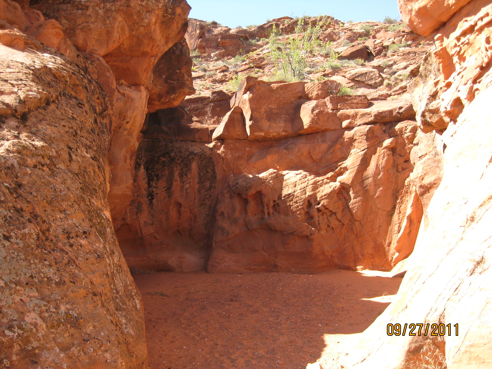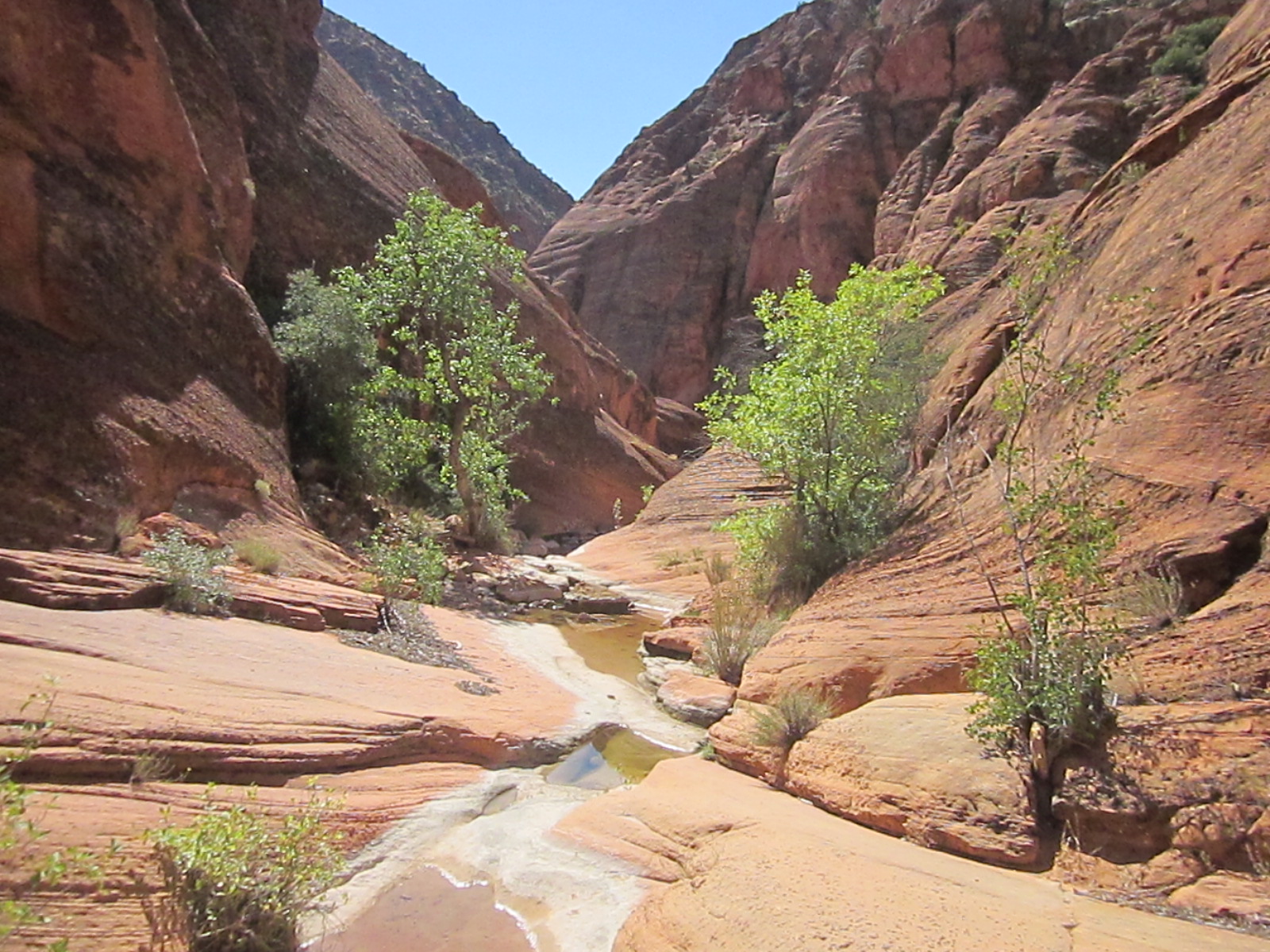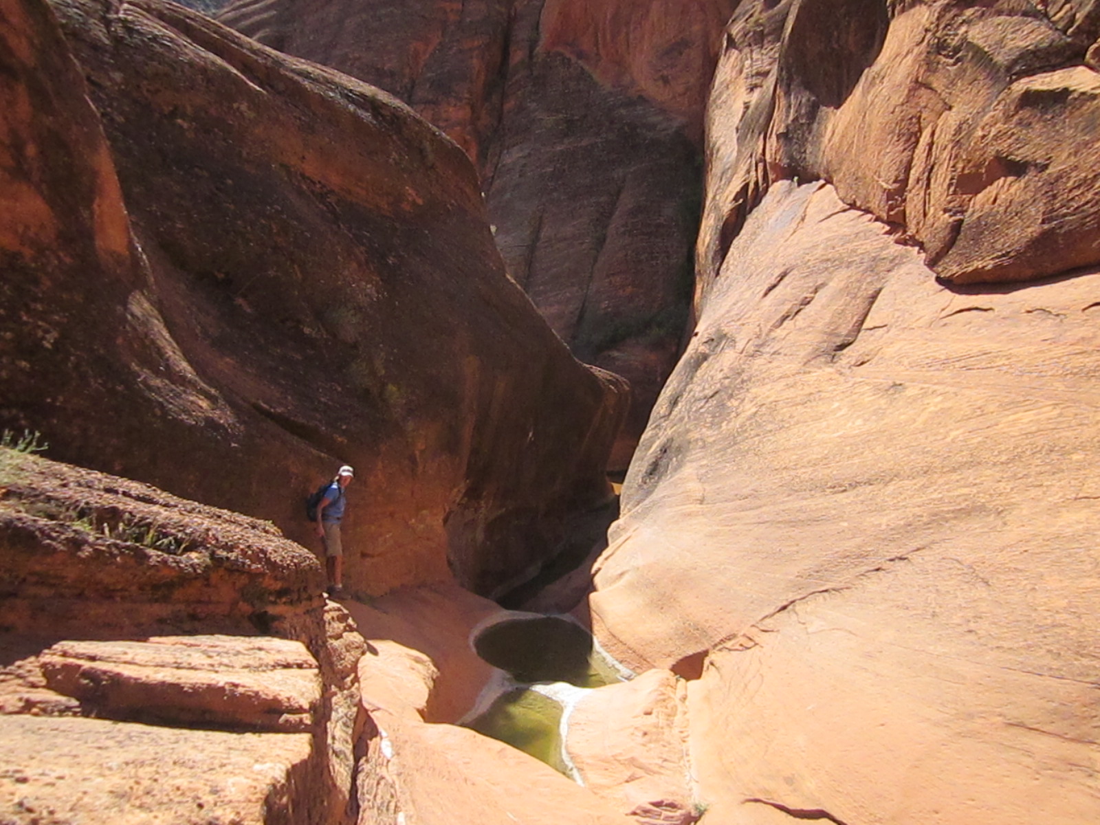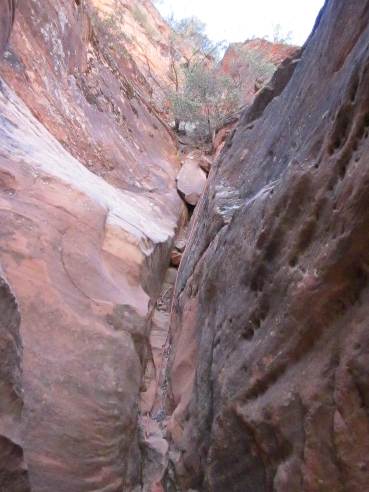 The Red Reef trail is comprised of three segments, each very different from the others and with very different user requirements.  The most popular segment starts out of the Bureau of Land Management’s Red Cliffs campground 1 mile west of Interstate 15 at Harrisburg.  This trail is relatively easy and used by large numbers of the general public during the spring and fall seasons when weather is pleasant. It follows the Quail Creek drainage out of the campground and enters a winding, beautiful red rock canyon with numerous opportunities for general recreation.  All but the first hundred yards or so are located in the Cottonwood Canyon wilderness area which is closed to bicycles.  Hikers will find the single track trail segment easy in most parts with some hilly spots until ½ mile up the canyon visitors must navigate around a large pool of water over an 8-foot sandstone wall with carved-out foot holds (locally called Moki steps) with assistance from an anchored rope.  It is unclear who, if anyone, maintains the security of the rope; thus, hikers use it at their own risk.  The pool is often used as a favorite swimming hole with jumpers, acting at their own risk.  Jumping or diving into pools along any portion of the creek is not recommended and can cause serious injury or worse due to shallow water and hidden obstacles.  From there the canyon continues up stream through a long slot and multiple dry falls, often filled with water during wet season or after rains.  The creek flows constantly during the spring season but often shuts down later in the year.  Hikers will get wet unless they choose somewhat difficult climbs above the drainage to circumvent the deepest pools.  This should only be done by persons knowledgeable of the safest routes.  At about 1½ miles from the campground trailhead, the designated trail route diverts to the left (south) up an unnamed side canyon at a spot that is not well marked other than by a user-created cairn.  This is the second segment.  This drainage will take visitors up to a high saddle and allow eventual access to the third and southern trail segment leading down to the Cottonwood trailhead.  The side canyon is less than 1 mile in length and involves numerous dry falls (sometimes referred to as pour-overs) with pools at their bottom that need to be circumvented within the steep, narrow walls of the canyon.  This will be an extreme challenge for many hikers who are not comfortable with steep slopes on red slickrock and who are uncomfortable with heights.  At a point about ¼ mile from the turn off, it is necessary to navigate a 30-foot narrow, vertical chimney with a single, user-installed rope to get beyond a large dry fall.  Use the rope at your own risk inasmuch as its safety and maintenance is unknown.  The climb requires physical dexterity, upper-body strength, and a cool mind, among other attributes helpful in a canyoneering environment.  It is highly recommended that this entire extreme but spectacular segment not be taken without a knowledgeable guide who has been through the canyon before.  An alternative, but undesignated, route used by a few hiking groups to the upper saddle involves taking the side canyon to the left immediately after the Moki steps at the large pool.  This canyon, however, involves significant rock scrambling over large boulders throughout its length and is considered dangerous by agency personnel and hiking guides. This route has contributed to a large number of injuries over the years.  It is considered an extreme segment and is not recommended for the general public.