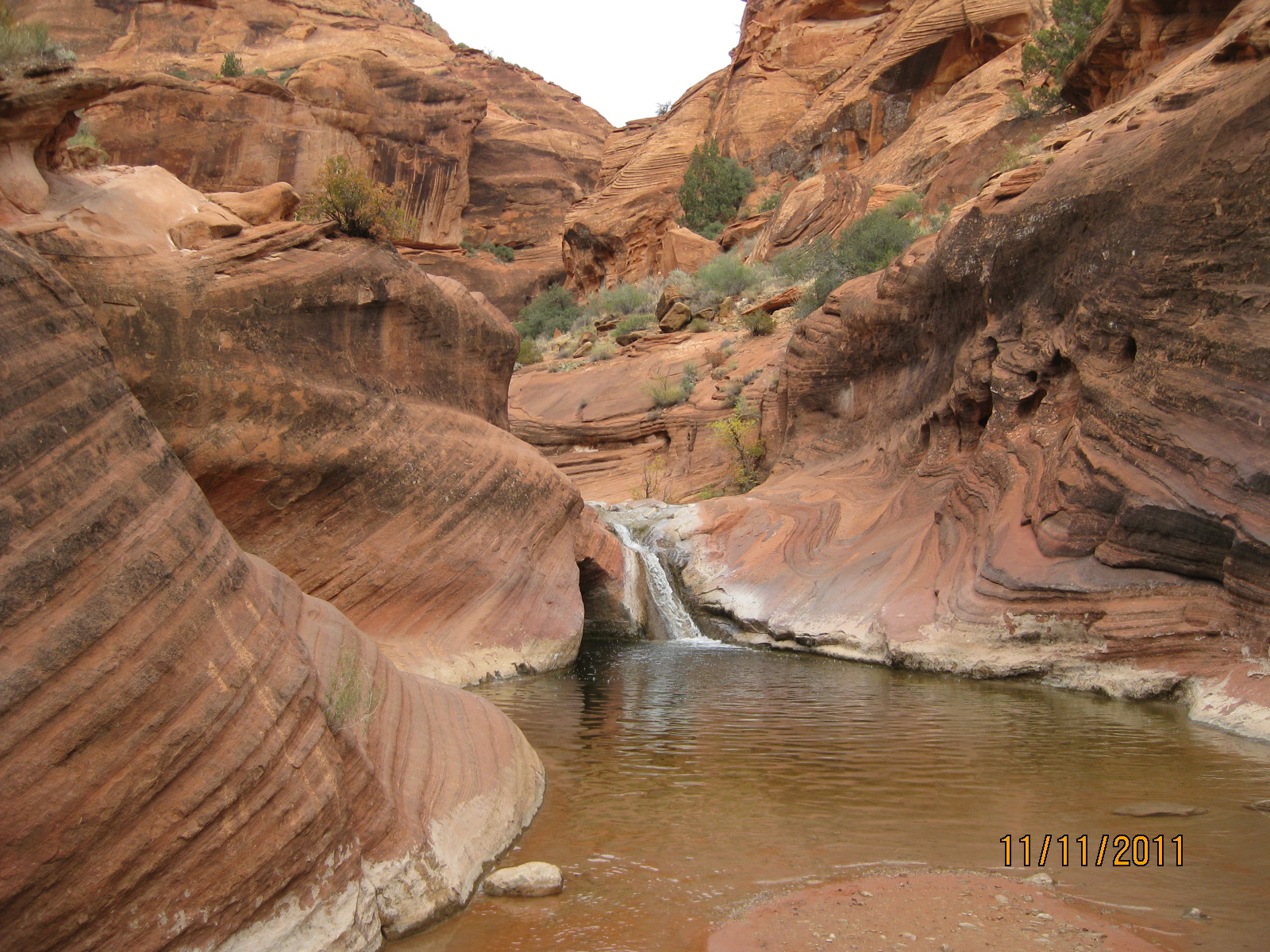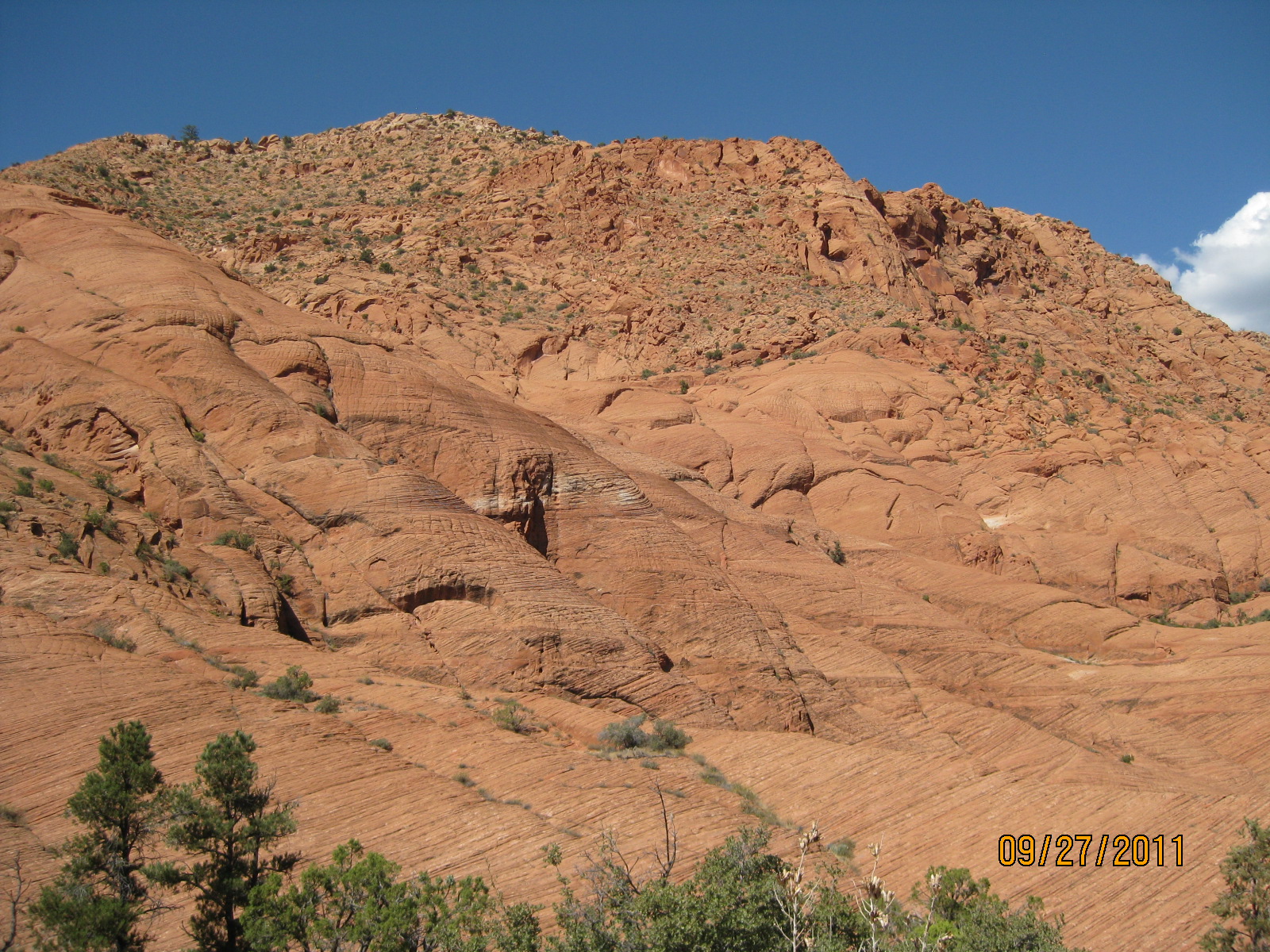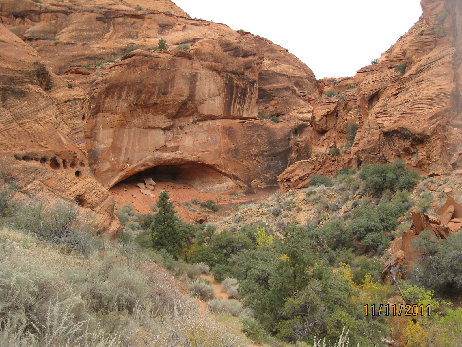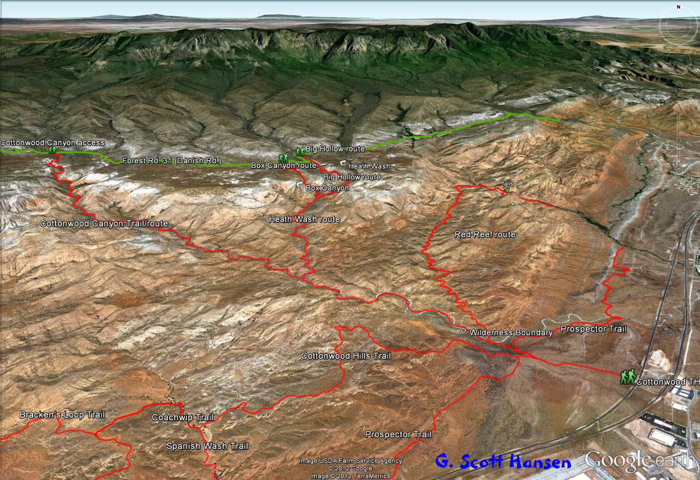 The Red Reef trail is comprised of three segments, each very different from the others and with very different user requirements.  The most popular segment starts out of the Bureau of Land Management’s Red Cliffs campground 1 mile west of Interstate 15 at Harrisburg.  This trail is relatively easy and used by large numbers of the general public during the spring and fall seasons when weather is pleasant. It follows the Quail Creek drainage out of the campground and enters a winding, beautiful red rock canyon with numerous opportunities for general recreation.  All but the first hundred yards or so are located in the Cottonwood Canyon wilderness area which is closed to bicycles.  Hikers will find the single track trail segment easy in most parts with some hilly spots until ½ mile up the canyon visitors must navigate around a large pool of water over an 8-foot sandstone wall with carved-out foot holds (locally called Moki steps) with assistance from an anchored rope.  It is unclear who, if anyone, maintains the security of the rope; thus, hikers use it at their own risk.  The pool is often used as a favorite swimming hole with jumpers, acting at their own risk.  Jumping or diving into pools along any portion of the creek is not recommended and can cause serious injury or worse due to shallow water and hidden obstacles.  From there the canyon continues up stream through a long slot and multiple dry falls, often filled with water during wet season or after rains.  The creek flows constantly during the spring season but often shuts down later in the year.  Hikers will get wet unless they choose somewhat difficult climbs above the drainage to circumvent the deepest pools.  This should only be done by persons knowledgeable of the safest routes.  At about 1½ miles from the campground trailhead, the designated trail route diverts to the left (south) up an unnamed side canyon at a spot that is not well marked other than by a user-created cairn.  This is the second segment.  This drainage will take visitors up to a high saddle and allow eventual access to the third and southern trail segment leading down to the Cottonwood trailhead.  The side canyon is less than 1 mile in length and involves numerous dry falls (sometimes referred to as pour-overs) with pools at their bottom that need to be circumvented within the steep, narrow walls of the canyon.  This will be an extreme challenge for many hikers who are not comfortable with steep slopes on red slickrock and who are uncomfortable with heights.  At a point about ¼ mile from the turn off, it is necessary to navigate a 30-foot narrow, vertical chimney with a single, user-installed rope to get beyond a large dry fall.  Use the rope at your own risk inasmuch as its safety and maintenance is unknown.  The climb requires physical dexterity, upper-body strength, and a cool mind, among other attributes helpful in a canyoneering environment.  It is highly recommended that this entire extreme but spectacular segment not be taken without a knowledgeable guide who has been through the canyon before.  An alternative, but undesignated, route used by a few hiking groups to the upper saddle involves taking the side canyon to the left immediately after the Moki steps at the large pool.  This canyon, however, involves significant rock scrambling over large boulders throughout its length and is considered dangerous by agency personnel and hiking guides. This route has contributed to a large number of injuries over the years.  It is considered an extreme segment and is not recommended for the general public.