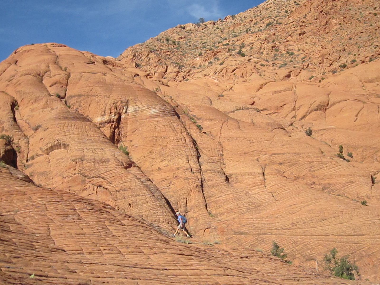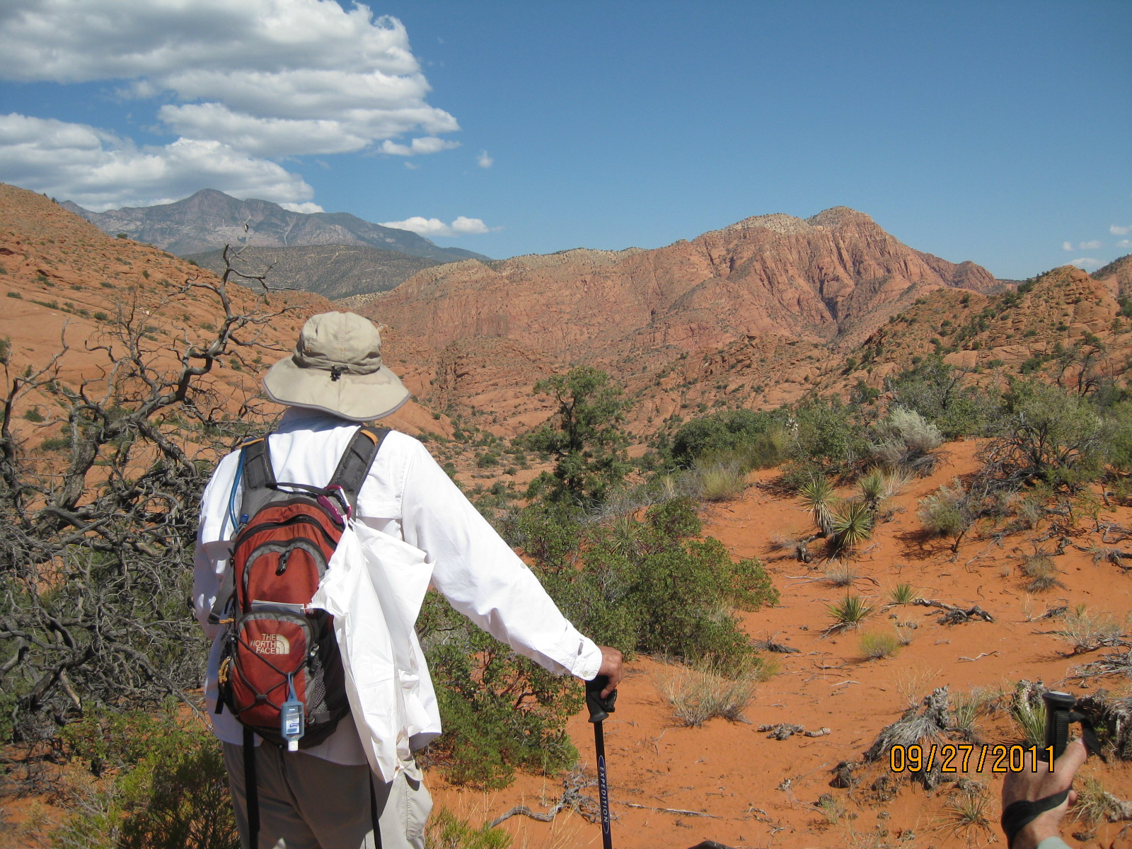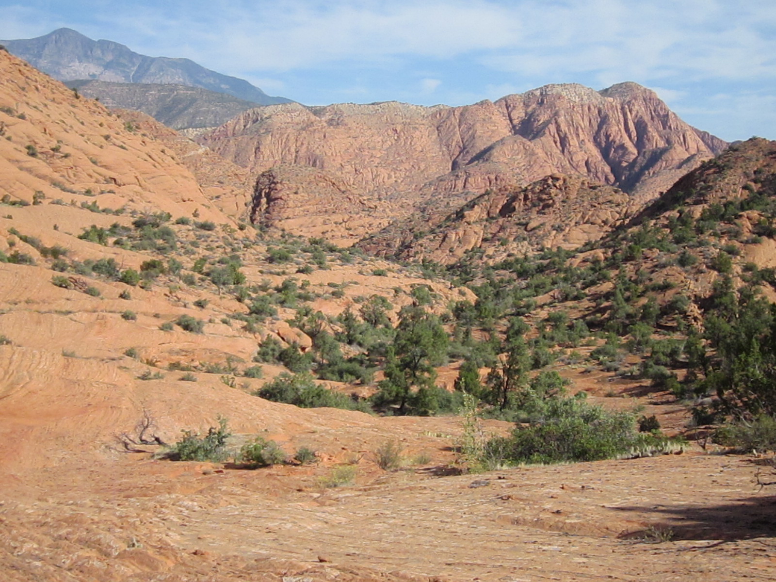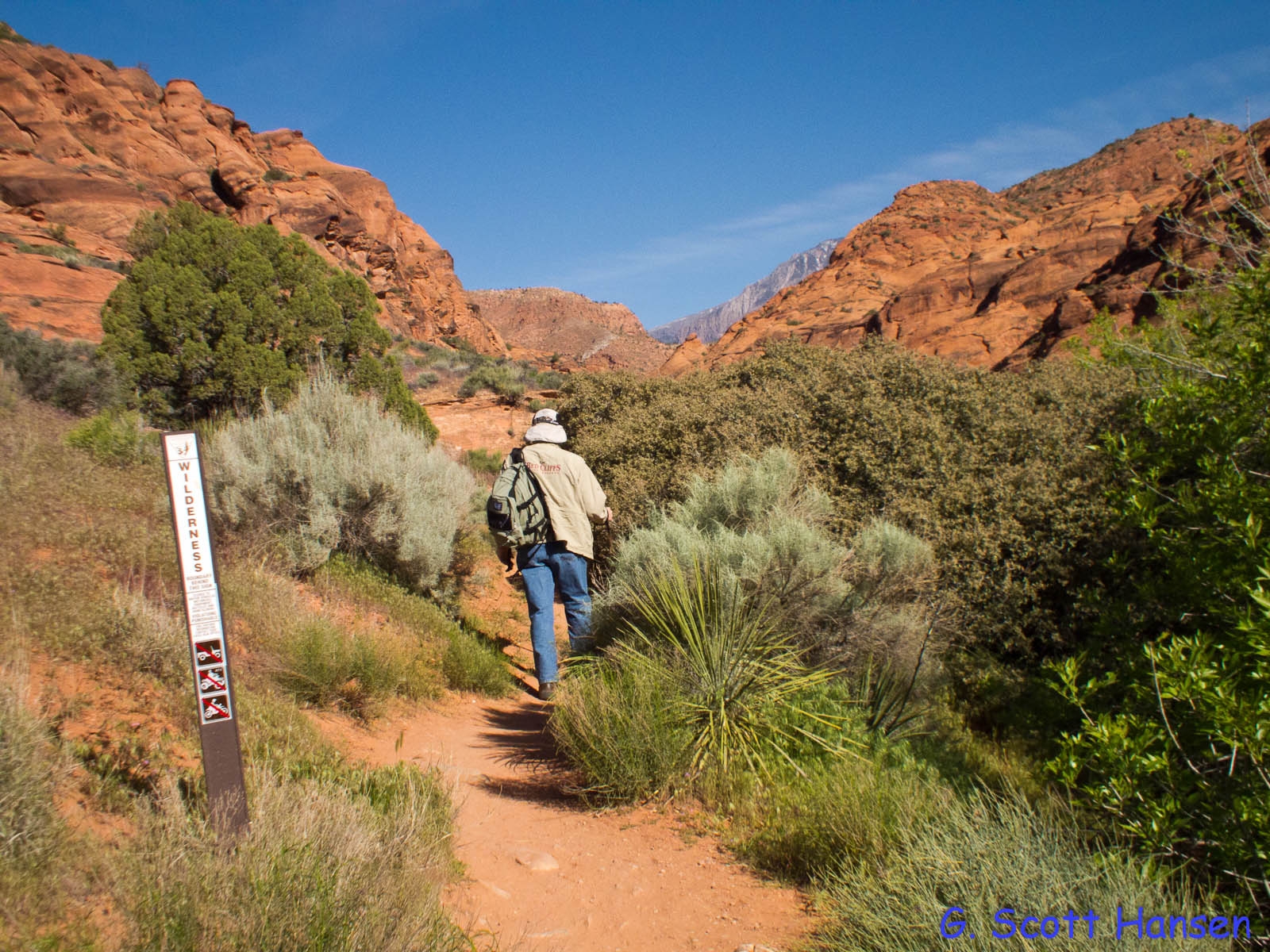 Once on top of the saddle, visitors will enjoy outstanding views of red and white sandstone cliffs and broad expanses of checkerboard slickrock, much of it easily accessible to hikers of all abilities.  Over the next half mile or so, visitors should follow the western edge of the saddle south as the land slopes gently downward toward the southern canyon complex that will take them to the last segment of the trail.  Most drainages, faint user trails, and a few user-built cairns will guide hikers to the narrow canyon which consists of numerous slots, small dry falls and beautiful red rock formations.  Once into the canyon, hikers will travel a winding, easy to moderately difficult route about 3½ miles to reach the Cottonwood trailhead, finishing the hike on the eastern-most portion of the Cottonwood Canyon trail.  The entire trail can be taken in reverse order starting at the Cottonwood trailhead (often used when hiking only the southern segment – a popular and fun alternative involving a four mile hike up through the high saddle before turning around to return to Cottonwood) or done as a loop hike by returning to the Red Cliffs area via the northern segment of the Prospector trail (10 plus miles total).  When hiking the entire trail out of the Cottonwood trailhead, the entrance to the middle canyon segment is readily found by staying against the west side of the upper saddle and following the drainage that drops off to the north.  No signage is posted to assist in locating its position.  Elevation at the Red Cliffs campground is about 3220 feet, at the highest point on the upper saddle about 3760 feet, and at the Cottonwood trailhead about 3280 feet.  Total up and down elevation change is about 1700 feet for the entire one way hike.  The connecting side canyon and a half mile of the upper Quail Creek drainage lie inside the Cottonwood Forest wilderness area on the Dixie National Forest. The remaining portions of the trail lie on lands administered by the Bureau of Land Management in the Cottonwood Canyon wilderness area inside the boundaries of the Red Cliffs NCA.