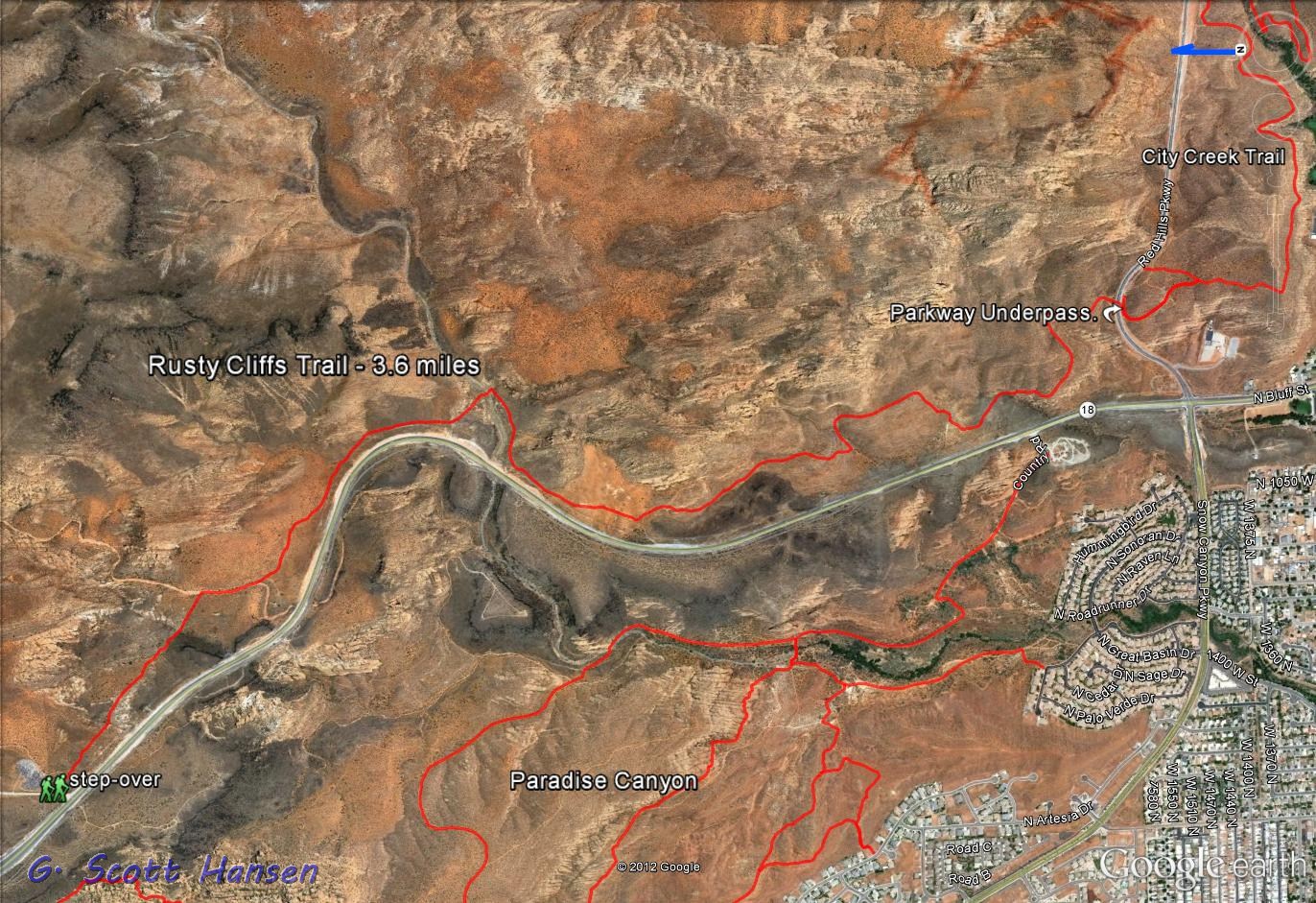 - This map shows the Rusty Cliffs trail and its relationship with State Route 18 and Red Cliffs Parkway.