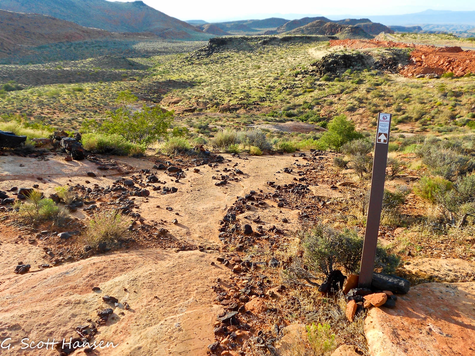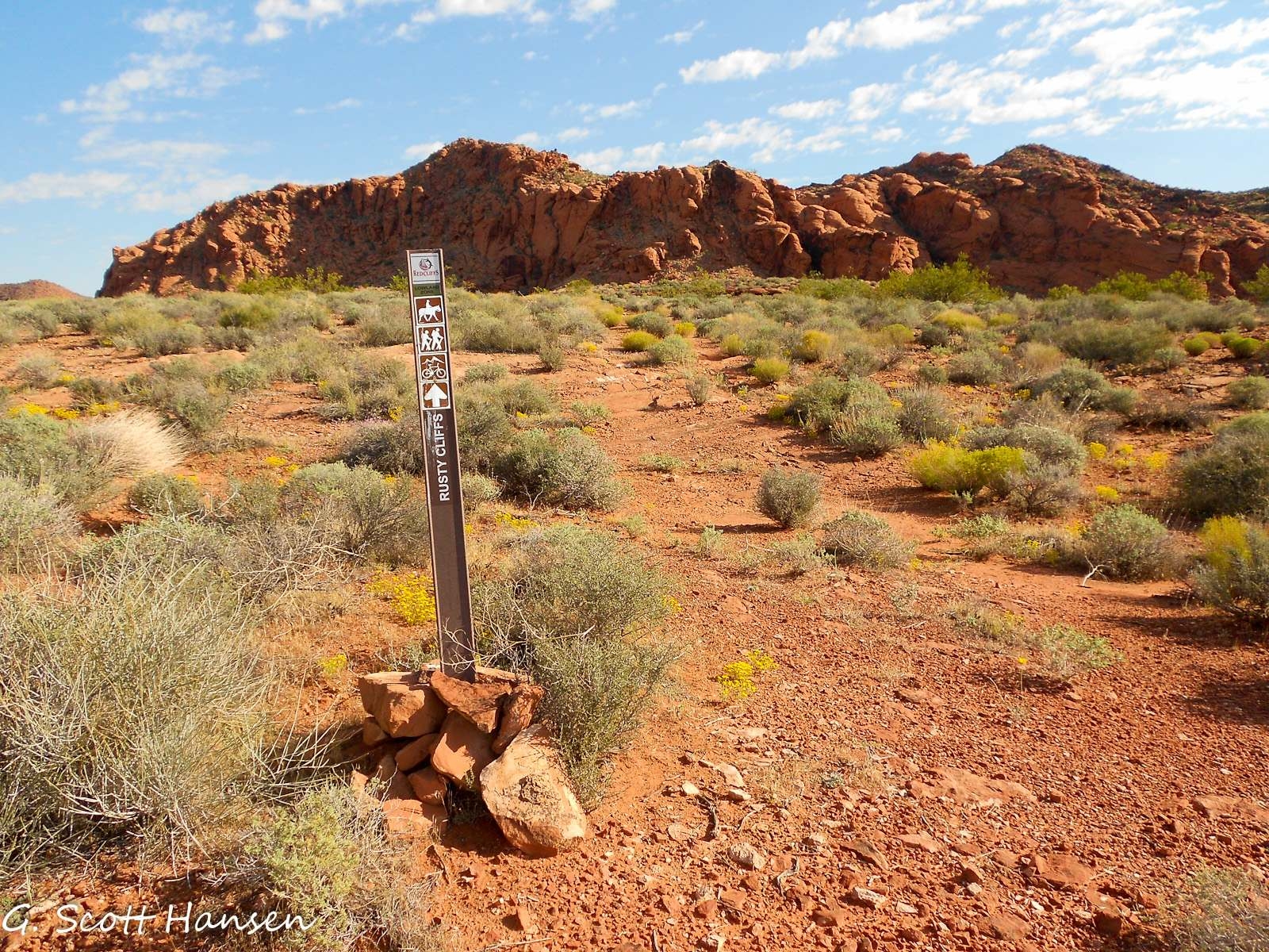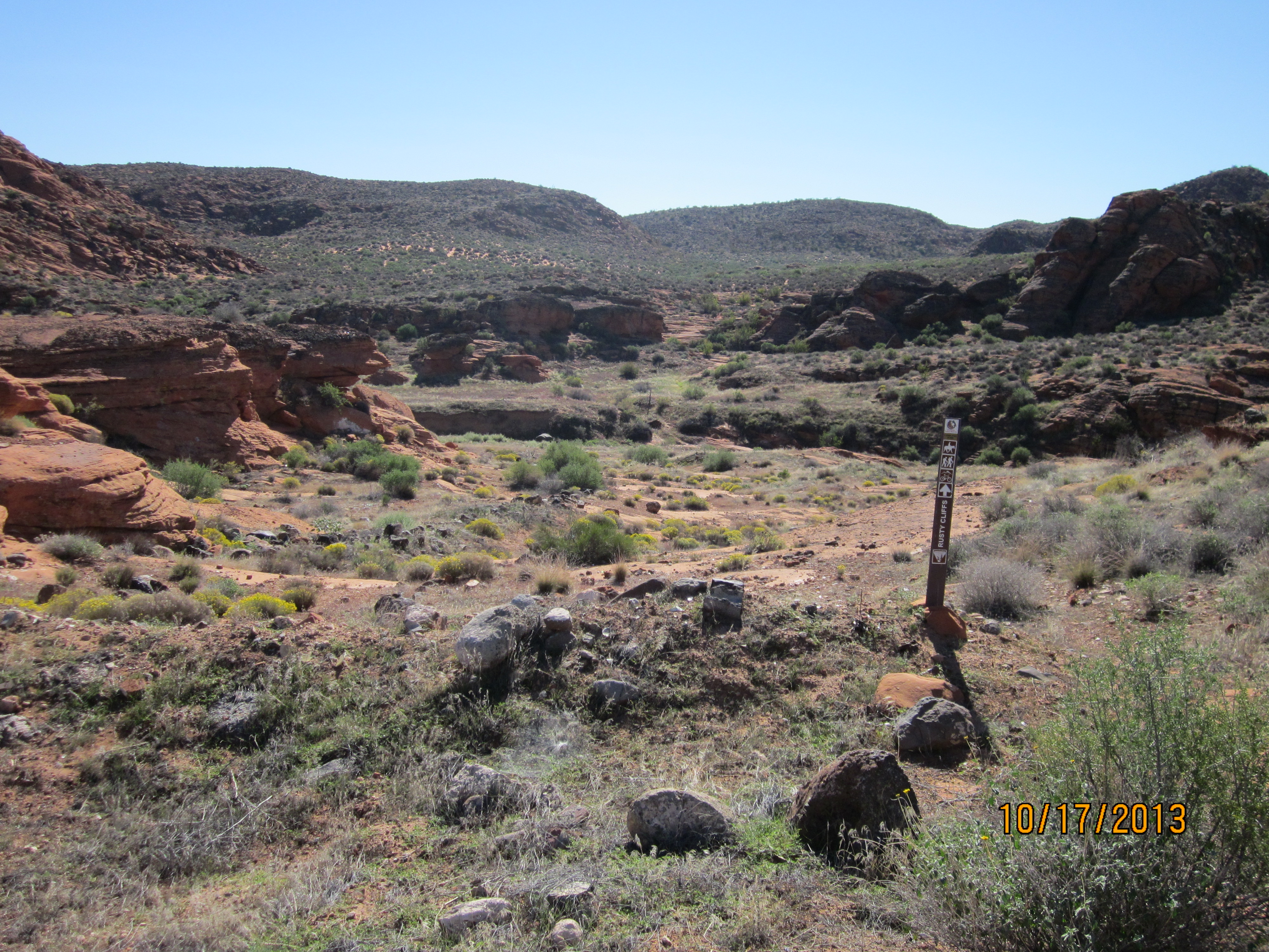 The Rusty Cliffs trail is about 3.5 miles in length with a net elevation gain from south to north of about 400 feet and a total up/down elevation change of 910 feet (650 up, 265 down). The trail is accessed from the north via a step-over in an unmaintained parking area off State Highway 18. From the south it is accessed from the north end of the City Creek trail, or via a step-over 200 yards to the east of the underpass on the south side of the Red Hills Parkway to access the dugway that drops down to the underpass. The northern part of the trail is primarily a single track, dirt path that is overgrown by vegetation in many areas. Most of the time, the trail/route can be determined by sighting one trail sign to another. The southern section of the trail is primarily an old, 2-track road that is also overgrown in places due to limited use. A couple of sections of the trail follow the fence line near the state highway. Most of the trail is far enough removed or hidden from the highway, however, to provide reasonable seclusion from the traffic. The trail provides some interesting views of the sandstone formations that lie on the east side of the trail. With final construction of the Red Hills Parkway complete, including the underpass, it is expected that the route will receive increased use from equestrians and other visitors. Prior to the area being protected by the RCDR, thoughtless shooters left much broken glass on sections near the highway. Other than the southern-most part of the trail on St. George City land, the traillies entirely on lands administered by the Bureau of Land Management in the Red Cliffs NCA.