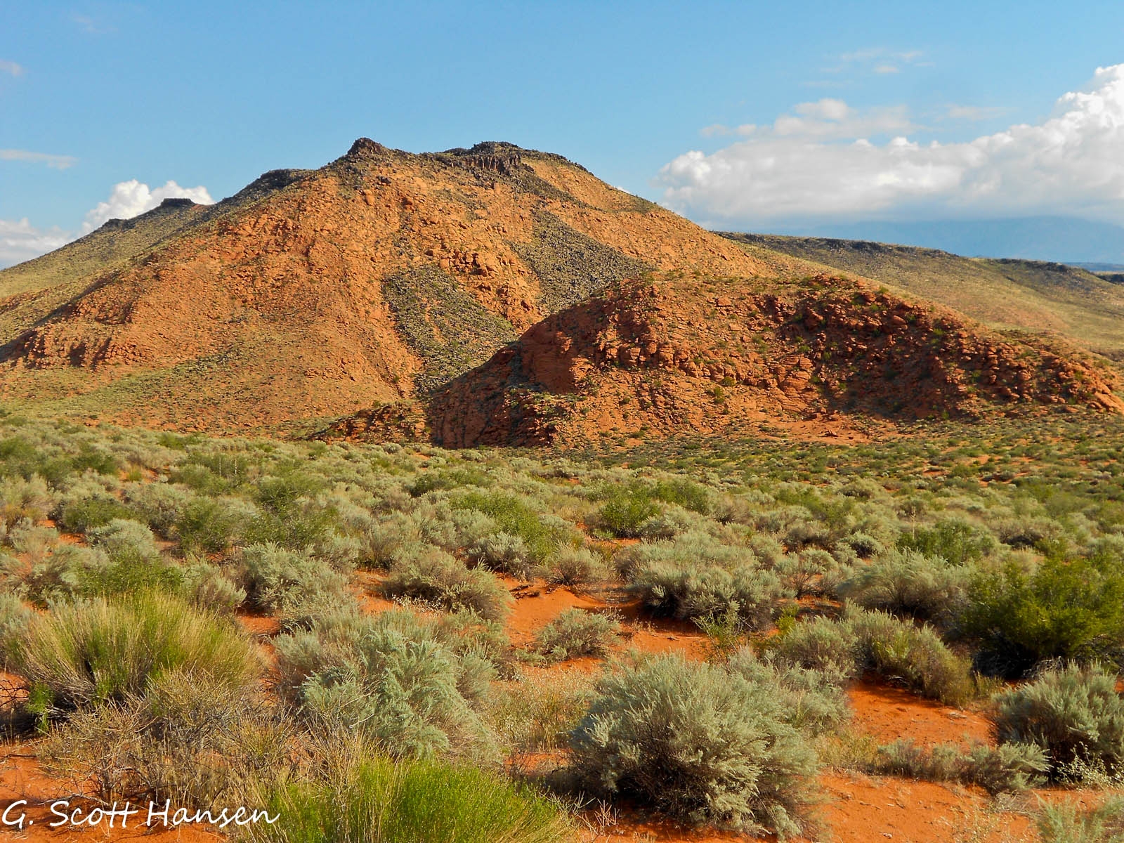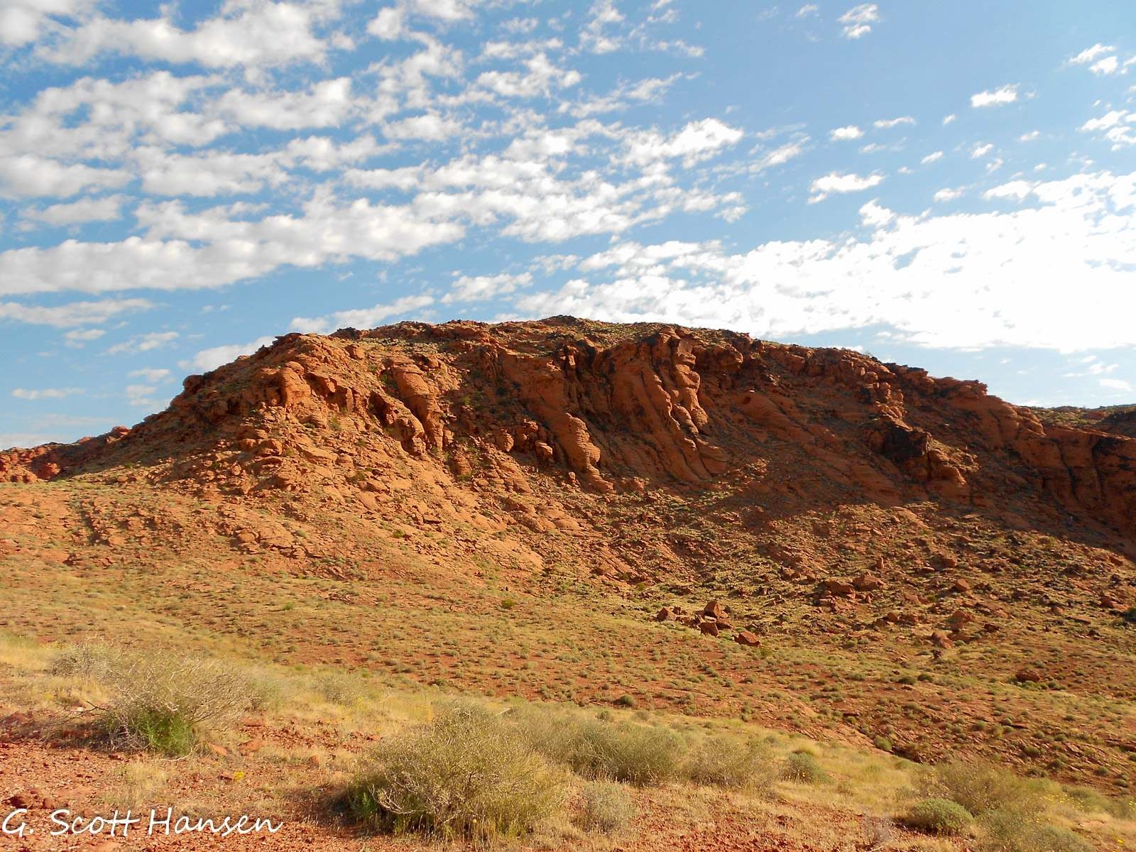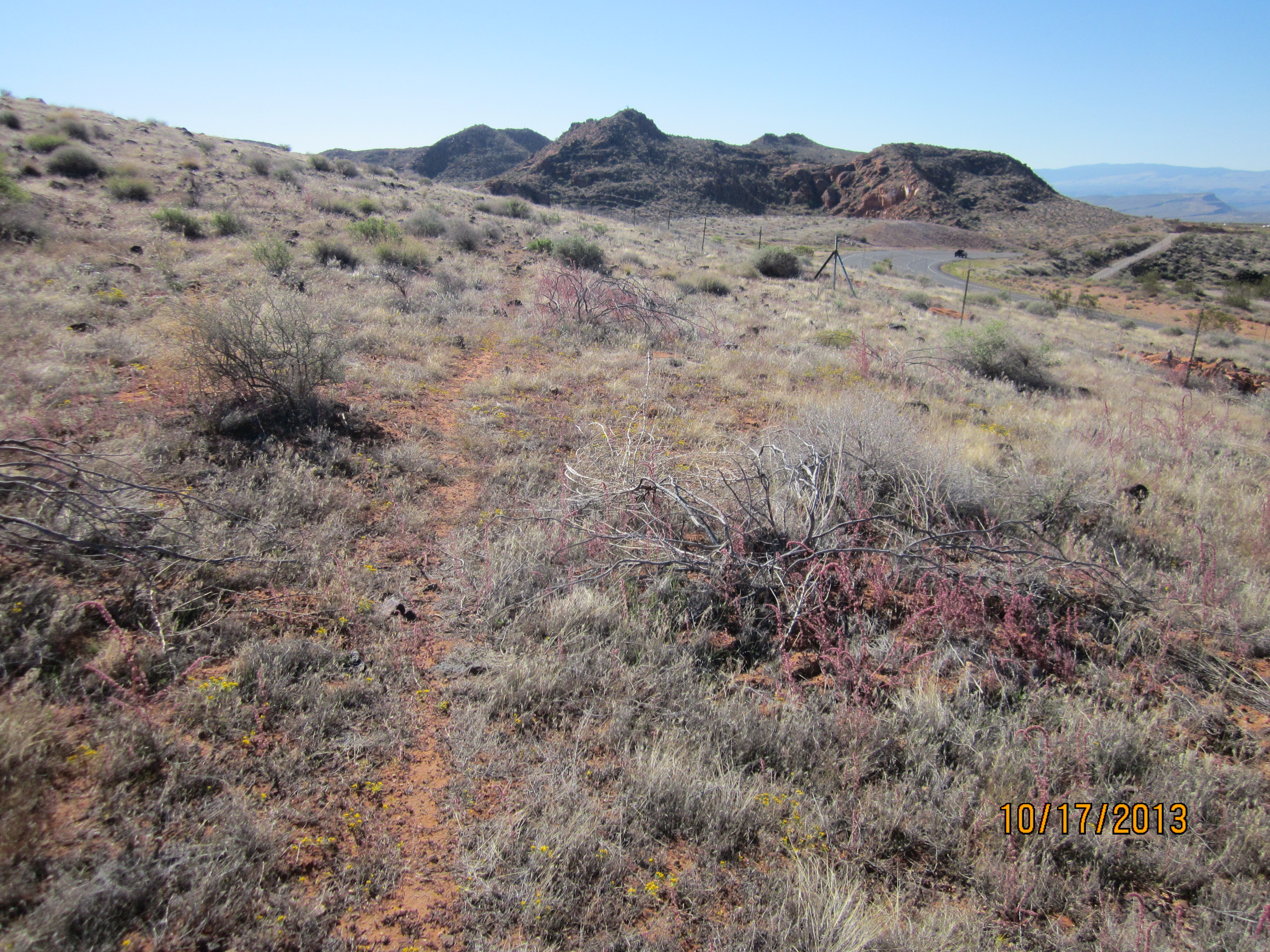 The Rusty Cliffs trail is about 3.5 miles in length with a net elevation gain from south to north of about 400 feet and a total up/down elevation change of 910 feet (650 up, 265 down). The trail is accessed from the north via a step-over in an unmaintained parking area off State Highway 18. From the south it is accessed from the north end of the City Creek trail, or via a step-over 200 yards to the east of the underpass on the south side of the Red Hills Parkway to access the dugway that drops down to the underpass. The northern part of the trail is primarily a single track, dirt path that is overgrown by vegetation in many areas. Most of the time, the trail/route can be determined by sighting one trail sign to another. The southern section of the trail is primarily an old, 2-track road that is also overgrown in places due to limited use. A couple of sections of the trail follow the fence line near the state highway. Most of the trail is far enough removed or hidden from the highway, however, to provide reasonable seclusion from the traffic. The trail provides some interesting views of the sandstone formations that lie on the east side of the trail. With final construction of the Red Hills Parkway complete, including the underpass, it is expected that the route will receive increased use from equestrians and other visitors. Prior to the area being protected by the RCDR, thoughtless shooters left much broken glass on sections near the highway. Other than the southern-most part of the trail on St. George City land, the traillies entirely on lands administered by the Bureau of Land Management in the Red Cliffs NCA.
