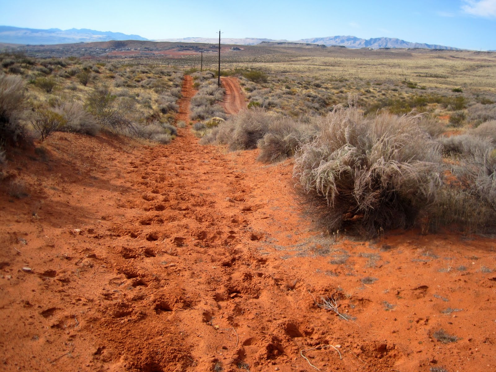 The Sand Hill trail breaks off from the lower Bone Wash trail on the west and joins the Grapevine trail on the east, a distance of about1.7 miles.  The trail runs through a deep, sandy soil throughout its length and is not recommended for bikers.  Popular with equestrians who combine the trail with other linked routes for longer rides, the trail is also used occasionally by hikers who often link it with the Dino Cliffs trail and associated access routes for a nice 5-mile loop.  Hikers will enjoy the trail more after a rain or during the wet season when the sand is firmer than during the hot, dry months. Visitors will be treated to spectacular views to the north of the canyons, plateaus, sandstone cliffs, red rock formations, lava escarpments, and mountains in the Cottonwood Canyon Wilderness Area and Dixie National Forest.  From the Bone Wash junction, elevation gain to the high point is about 560 feet with a total up and down elevation change of about 820 feet.  The trail runs across lands administered by SITLA.