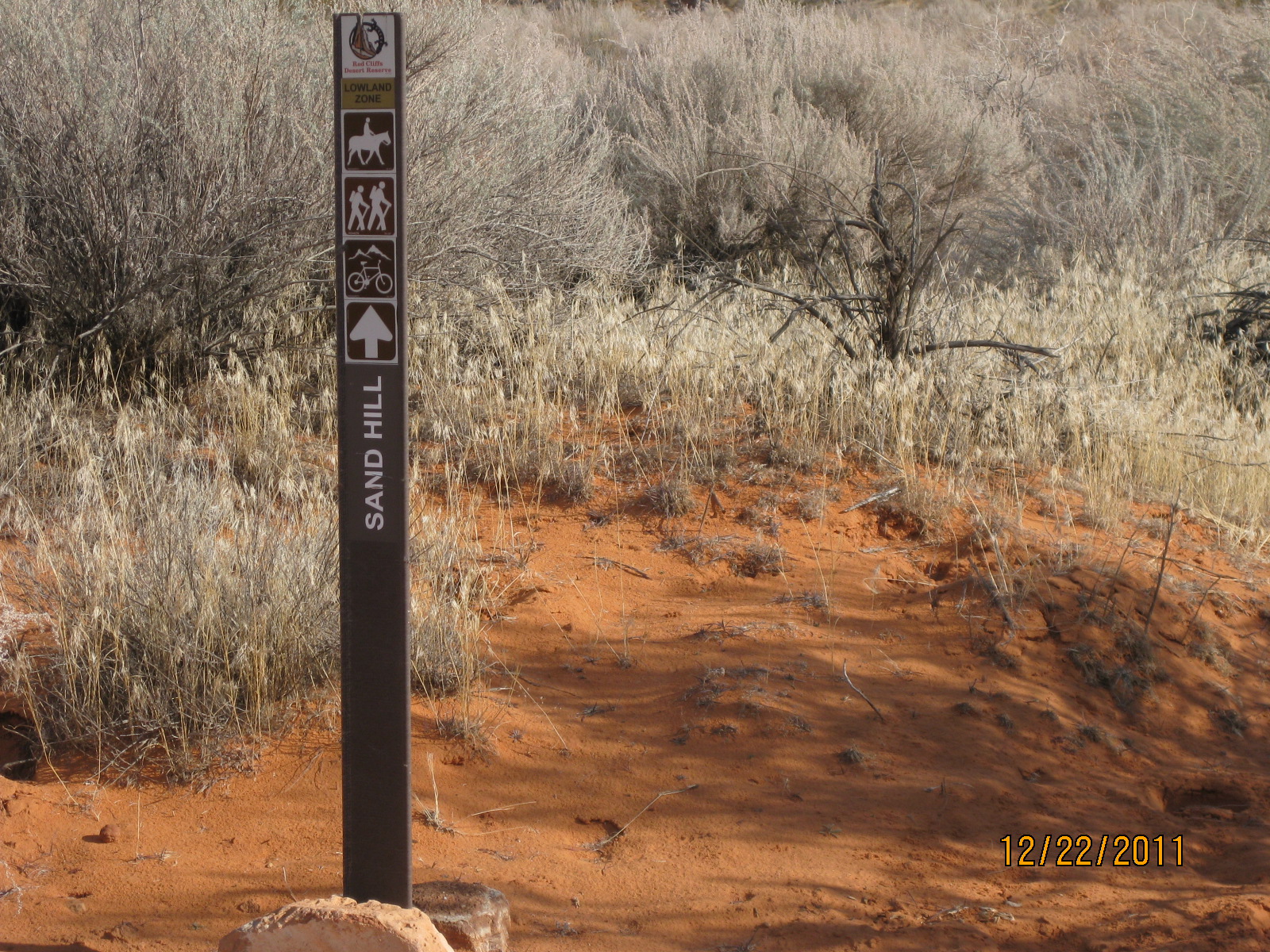- This trail sign indicates the junction of the west end of the Sand Hill trail with the Bone Wash trail.