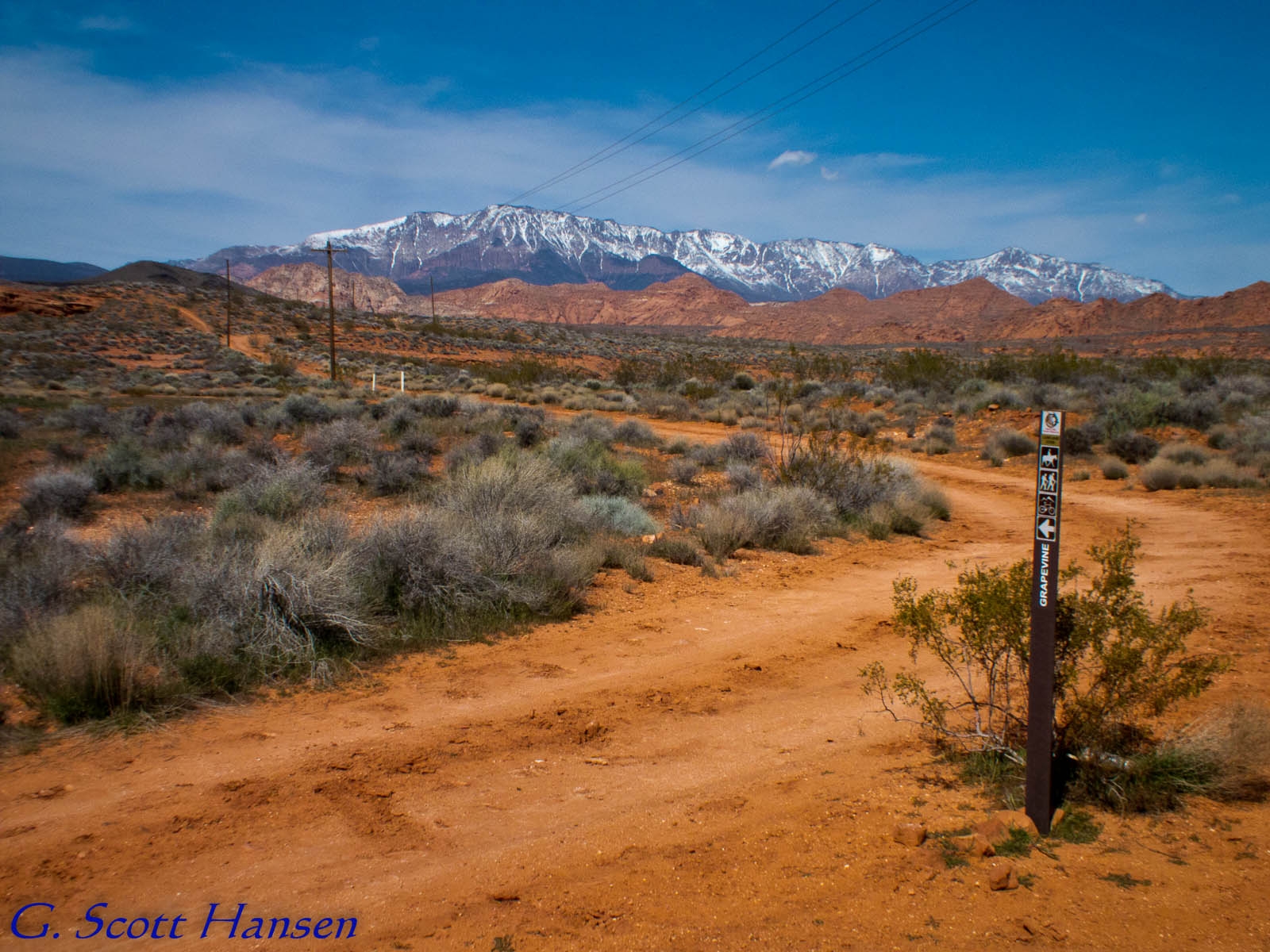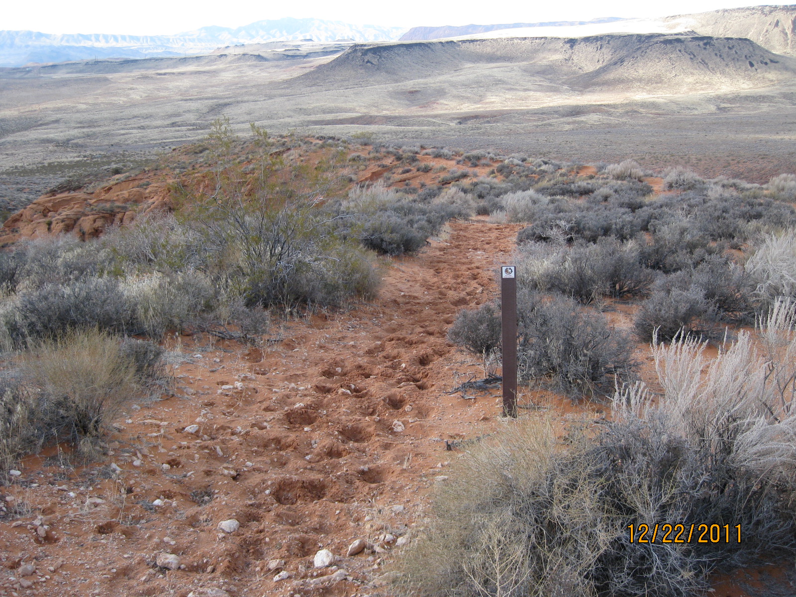 The Sand Hill trail breaks off from the lower Bone Wash trail on the west and joins the Grapevine trail on the east, a distance of about1.7 miles. The trail runs through a deep, sandy soil throughout its length and is not recommended for bikers. Popular with equestrians who combine the trail with other linked routes for longer rides, the trail is also used occasionally by hikers who often link it with the Dino Cliffs trail and associated access routes for a nice 5-mile loop. Hikers will enjoy the trail more after a rain or during the wet season when the sand is firmer than during the hot, dry months. Visitors will be treated to spectacular views to the north of the canyons, plateaus, sandstone cliffs, red rock formations, lava escarpments, and mountains in the Cottonwood Canyon Wilderness Area and Dixie National Forest. From the Bone Wash junction, elevation gain to the high point is about 560 feet with a total up and down elevation change of about 820 feet. The trail runs across lands administered by SITLA.