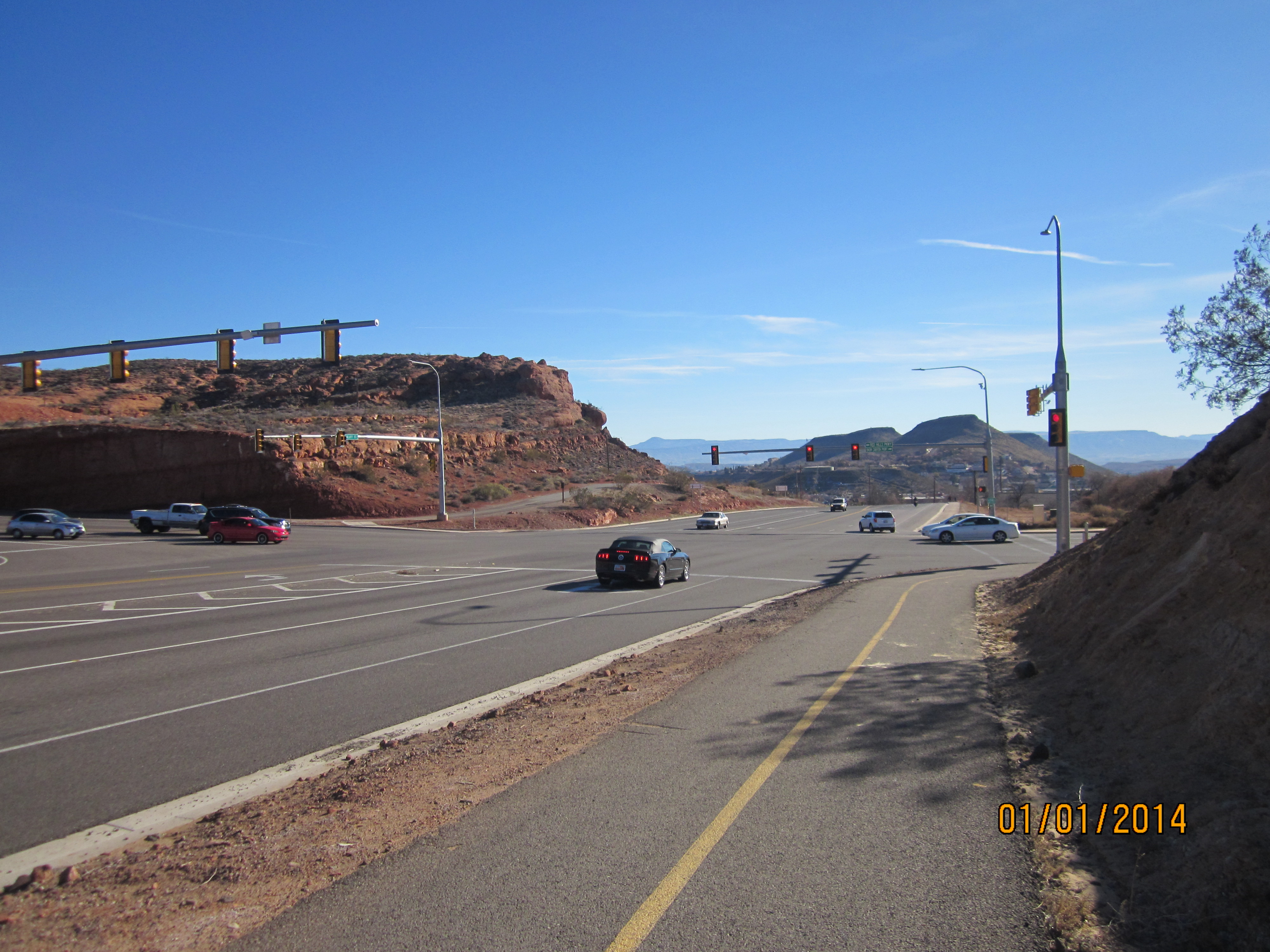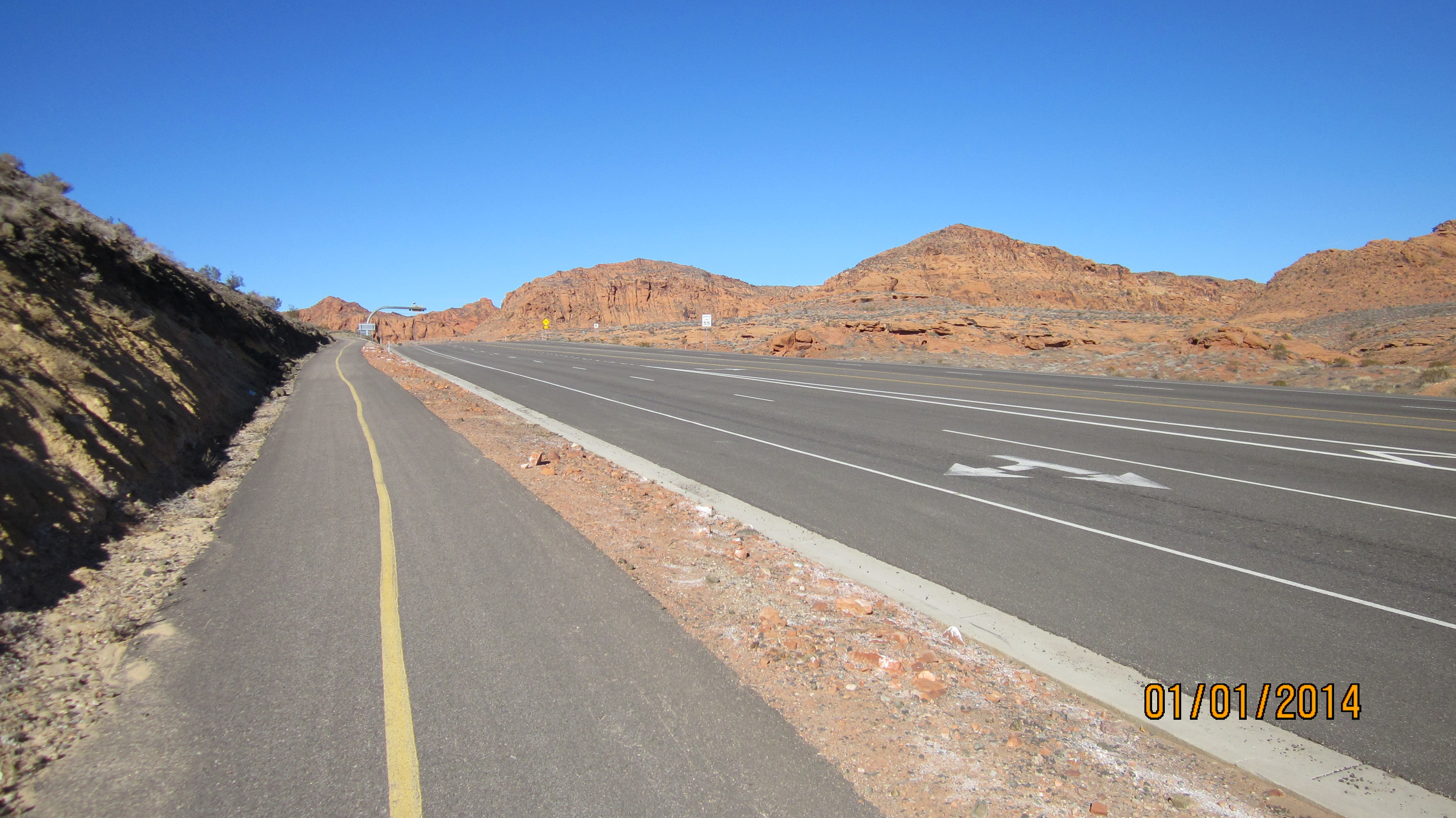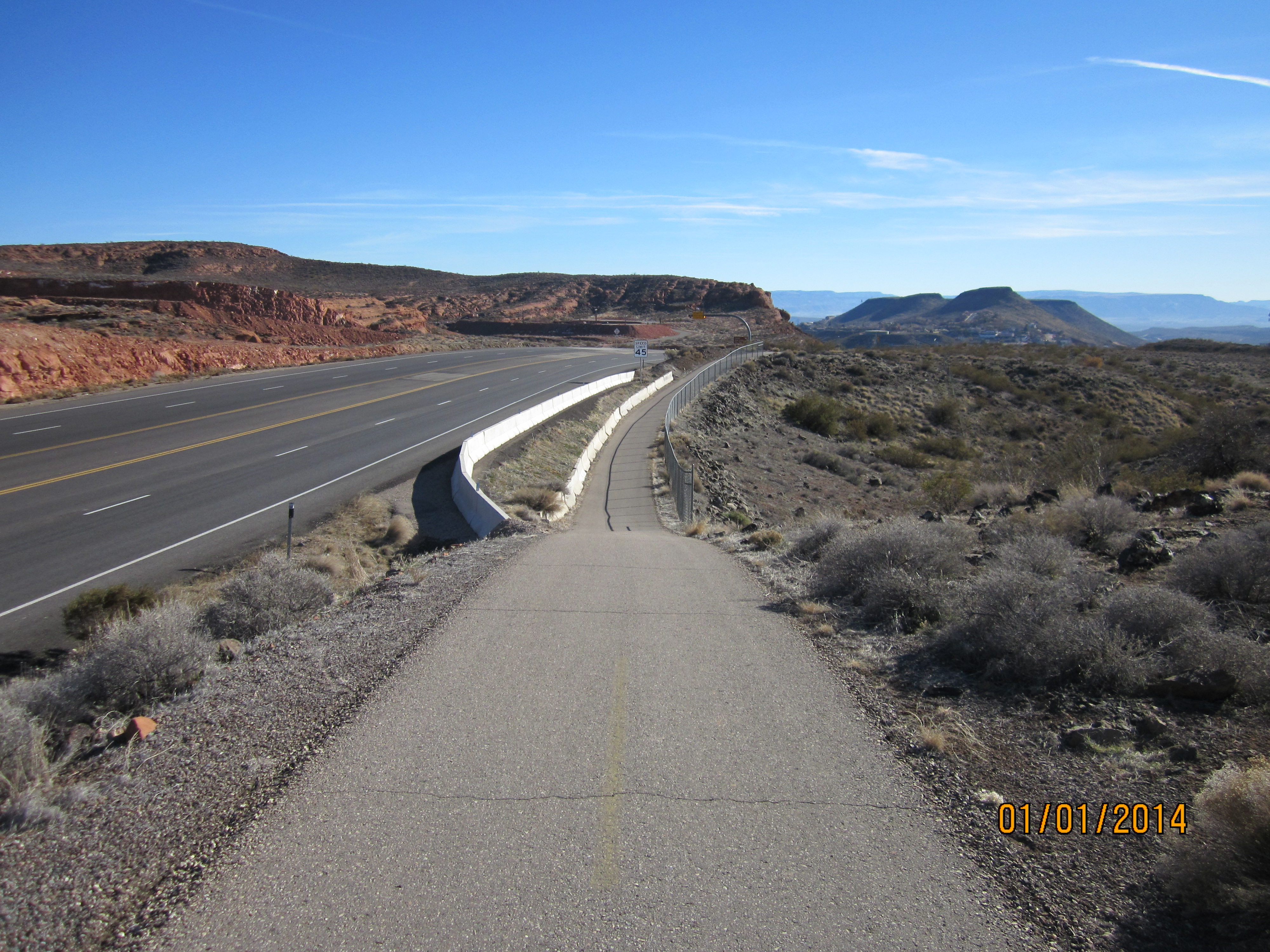 The SR-18 trail runs approximately 7 miles from the junction of State Route 18 and Snow Canyon Parkway in northwest St. George to the trailhead parking area at the north entrance of Snow Canyon State Park. The paved trail lies entirely inside the right-of-way for the state highway and is administered by the City of St. George. The trail accommodates hikers and bikers but is not open to motorized vehicles and is unsuitable for equestrian use. Elevation at the south end of the trail is 3100 feet and rises to 4105 feet at the north trailhead. Numerous ups and downs occur throughout the length of the trail resulting in a total up and down elevation change of about 1500 feet. The ups and downs create some challenges for bikers riding north and make for an exhilarating (and possibly dangerous) ride when heading south. Visitors are cautioned to use discretion in controlling speed on the downhill segments. Portions of the trail are quite level and make easy travel for walkers and novice bikers, but many will find the length of the trail and the uphill locations to be strenuous in nature. Views from the trail on the south end include the red sandstone cliffs on the east side of the highway and red outcrops and black lava drainages to the west in Paradise Canyon. Further to the north visitors will have numerous opportunities to enjoy excellent views into Snow Canyon State Park and the white sandstone cliffs to the east behind Diamond Valley and Winchester Hills.