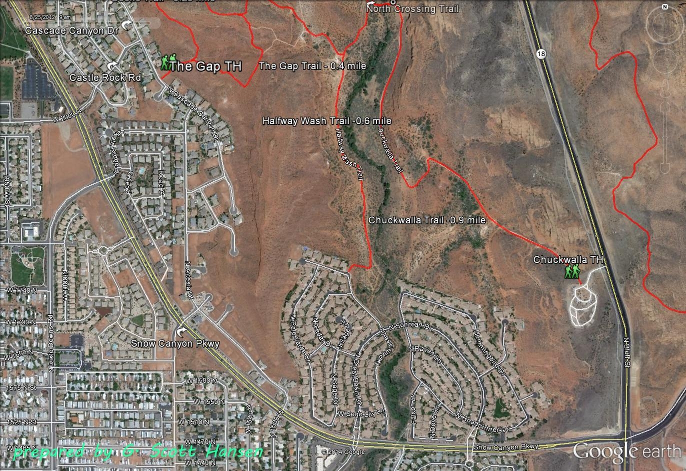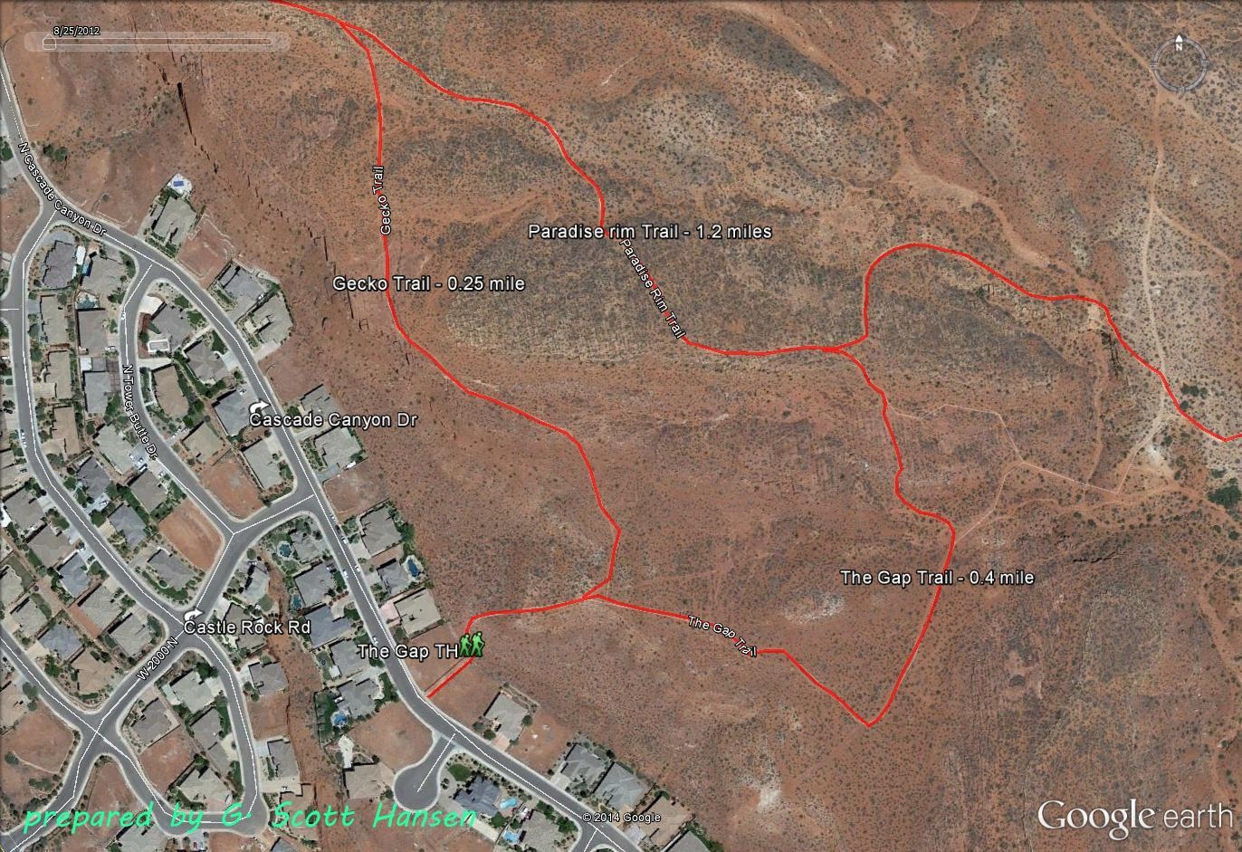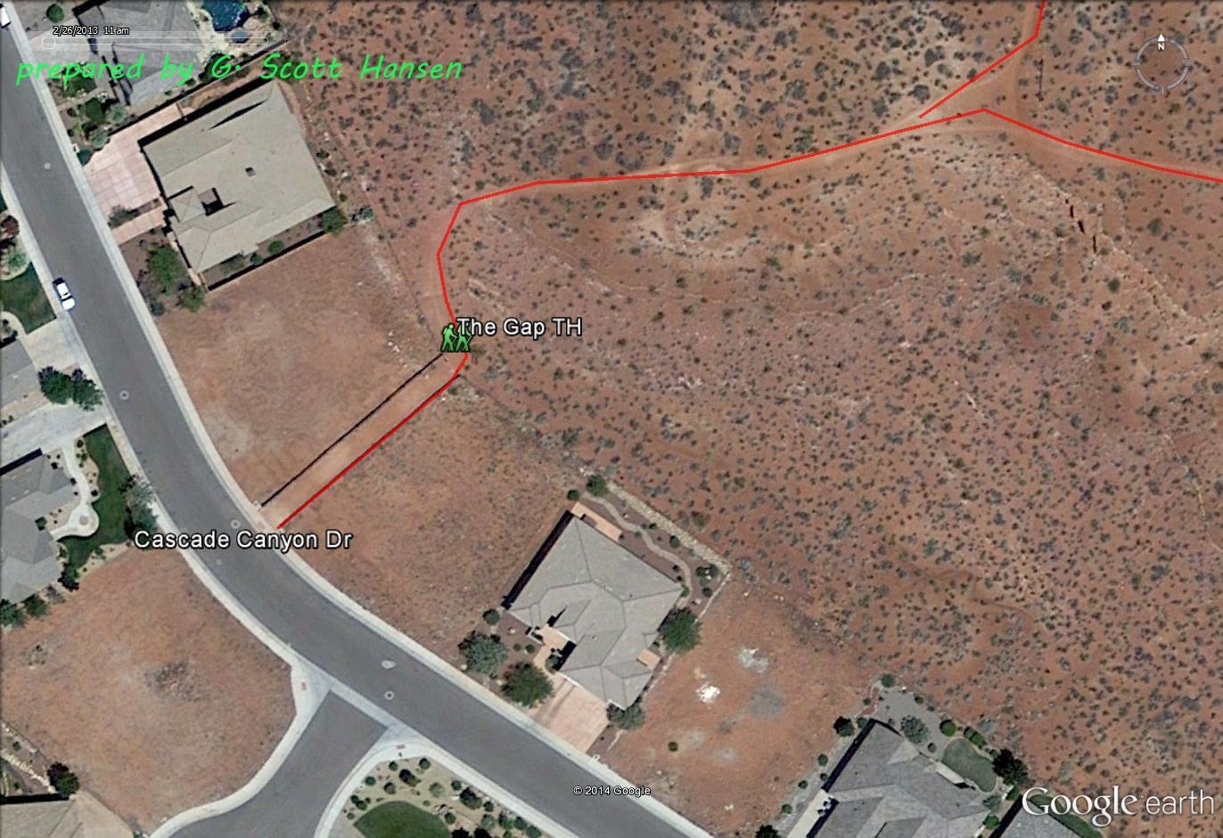 Travelling on Snow Canyon Parkway in northwest St. George, turn northeast on Castle Rock Road (one block west of the Lakota Drive traffic signal) and proceed to the “T” intersection with Cascade Canyon Drive.  Turn right and find the trailhead on your left in about 100 yards.  Only on-street parking is available.  Parking is recommended on the north side of the street.  Please refrain from parking directly in front of private residences wherever possible.  Hikers and bikers are accommodated at the trailhead.  No facilities exist other than a fenced entryway and trail signs with a map and agency rules and requirements.  Equestrian use is not recommended here.  Equestrians are better served out of the Chuckwalla trailhead off State Hwy 18 just north of its intersection with Snow Canyon Parkway.  The Gap trailhead serves multiple loop trails in Paradise Canyon starting with the Gap trail that has direct links to the Gecko and Paradise Rim trails and indirect links to the Turtle Wall, Halfway Wash, Beck Hill, Chuckwalla, Gila, and Scout Cave trails.  The trailhead entry lies on an easement across private ground and leads to lands administered by the BLM within the Red Cliffs NCA.
