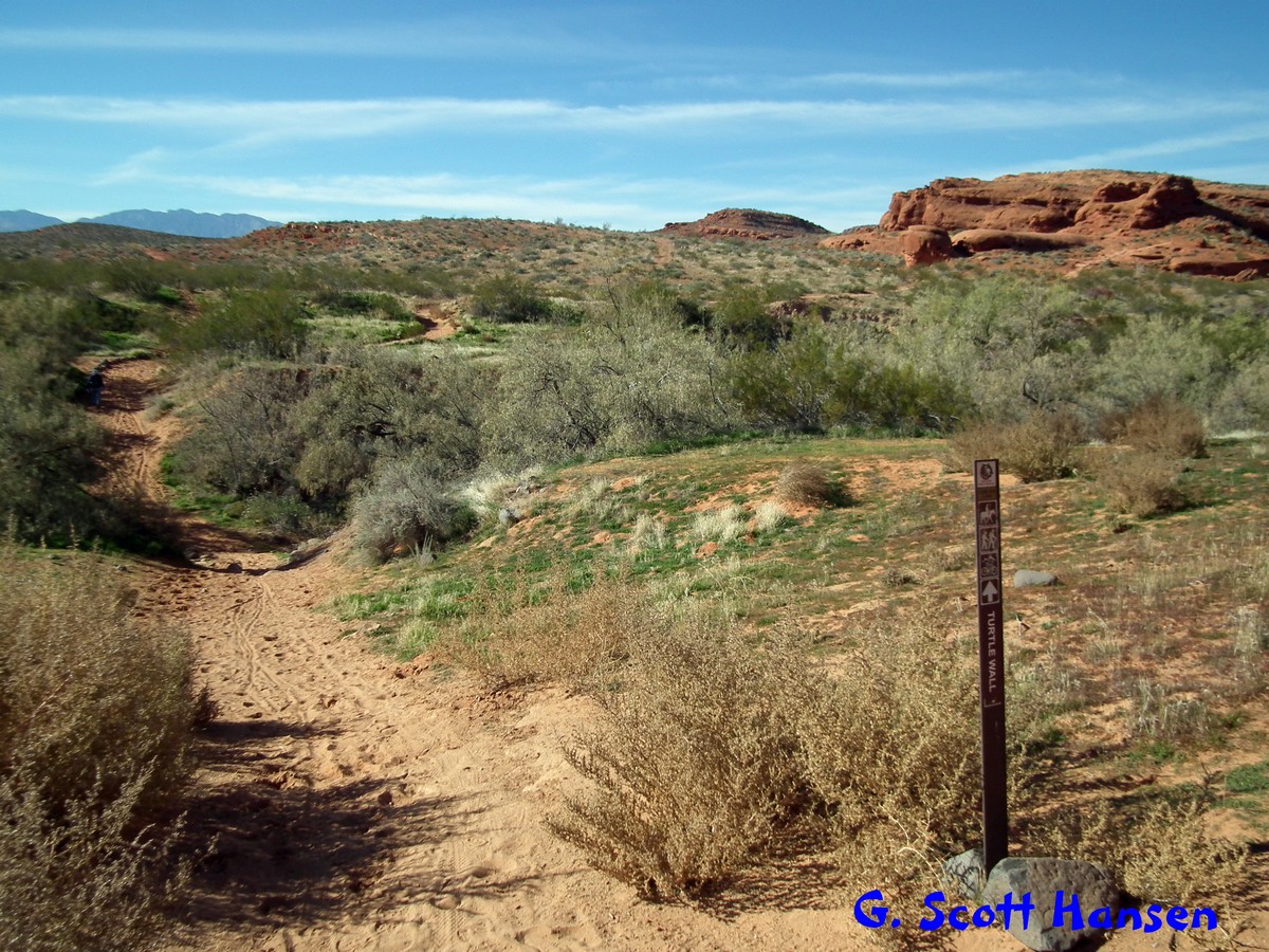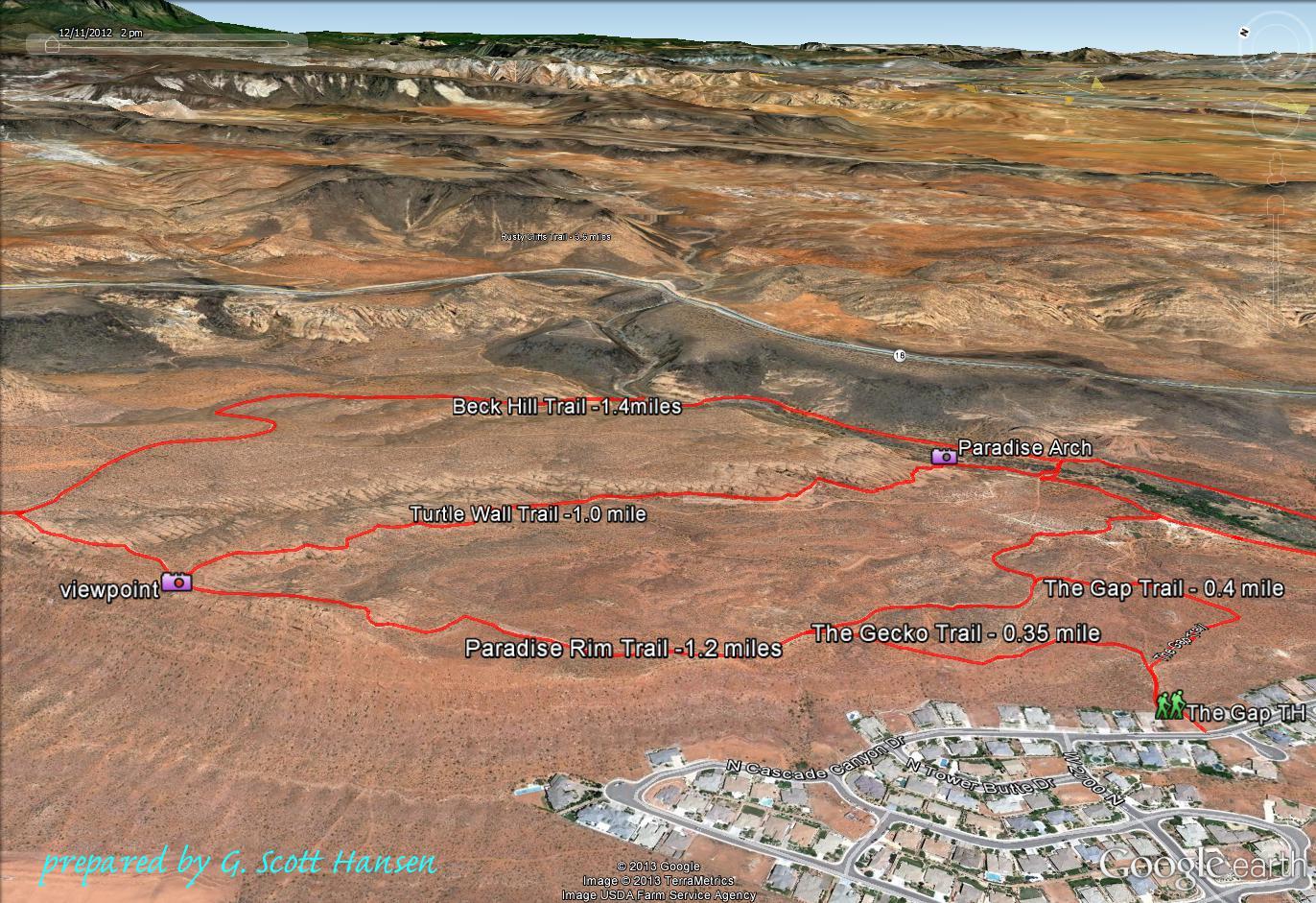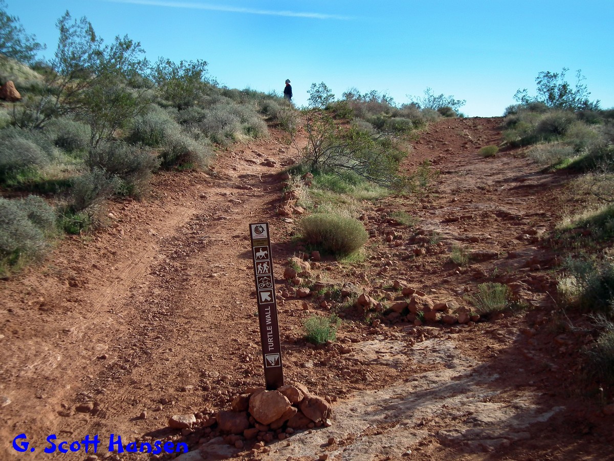 This very popular and scenic 1-mile trail segment is located in Paradise Canyon and can be accessed indirectly from the Chuckwalla, Halfway Wash, and Gap trailheads. It is most often hiked or ridden as part of a loop trail involving either the Chuckwalla, Paradise Rim, and Halfway Wash trails or the Chuckwalla, Beck Hill, and Paradise Rim trails. Other loop options are available. Partly a single track dirt trail and partly a slick rock or slightly rocky trail, it is most popular with hikers and bikers. From its junction with the Chuckwalla trail it is largely uphill to its junction with the Paradise Rim trail. See the Paradise Canyon trail map. The cumulative elevation gain is about 350 feet and the total up and down elevation change is about 480 feet. Completing the ever popular 3½ mile loop on the Chuckwalla, Turtle Wall, Paradise Rim, and Halfway Wash trails entails considerable up and down, making the loop of moderate difficulty. Most of the trail runs along the bottom of a spectacular red rock wall incised with grottos, small side canyons, and beautiful arches. Abundant desert wildlife including hawks, eagles, rabbits, lizards, birds, chuckwallas, and a rare Gila monster may be seen at various times of the year. Visitors are asked to keep pets on leash to protect the pets, the wildlife, and other visitors and to remain on designated trails to protect the critical habitat. The trail crosses lands administered by the U.S. Bureau of Land Management.
