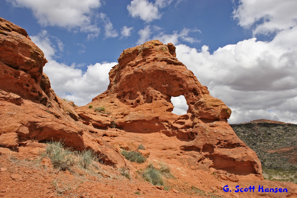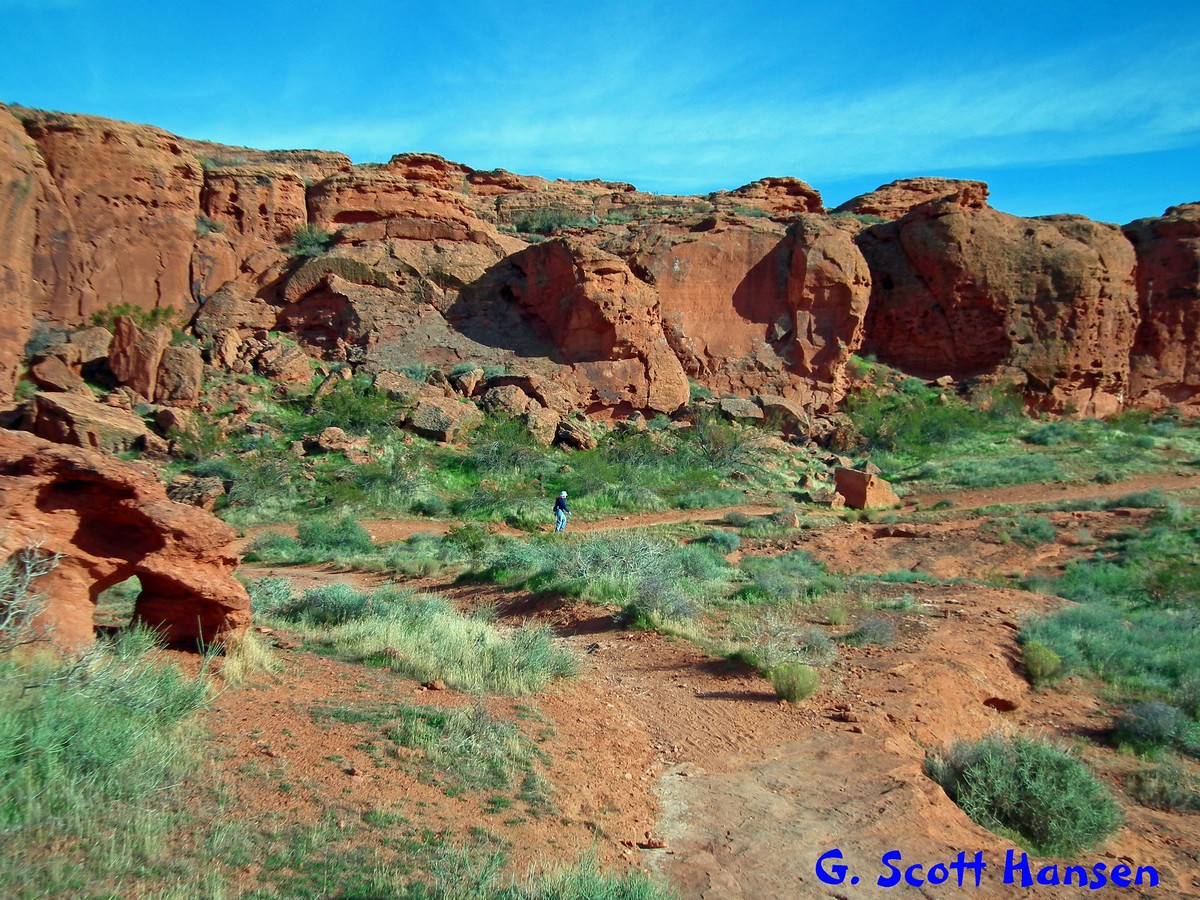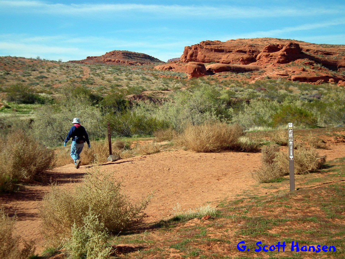 This very popular and scenic 1-mile trail segment is located in Paradise Canyon and can be accessed indirectly from the Chuckwalla, Halfway Wash, and Gap trailheads. It is most often hiked or ridden as part of a loop trail involving either the Chuckwalla, Paradise Rim, and Halfway Wash trails or the Chuckwalla, Beck Hill, and Paradise Rim trails. Other loop options are available. Partly a single track dirt trail and partly a slick rock or slightly rocky trail, it is most popular with hikers and bikers. From its junction with the Chuckwalla trail it is largely uphill to its junction with the Paradise Rim trail. See the Paradise Canyon trail map. The cumulative elevation gain is about 350 feet and the total up and down elevation change is about 480 feet. Completing the ever popular 3½ mile loop on the Chuckwalla, Turtle Wall, Paradise Rim, and Halfway Wash trails entails considerable up and down, making the loop of moderate difficulty. Most of the trail runs along the bottom of a spectacular red rock wall incised with grottos, small side canyons, and beautiful arches. Abundant desert wildlife including hawks, eagles, rabbits, lizards, birds, chuckwallas, and a rare Gila monster may be seen at various times of the year. Visitors are asked to keep pets on leash to protect the pets, the wildlife, and other visitors and to remain on designated trails to protect the critical habitat. The trail crosses lands administered by the U.S. Bureau of Land Management.